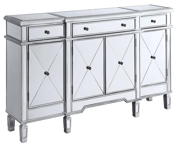 This accent cabinet offers a striking mix of function and glamour with its mirrored surface and silver finish. Framed in engineered wood, the cabinet features four doors with beveled mirrored panels and three top drawers for added storage. Inside, fixed shelving behind each door provides versatile organization for barware, tableware, or accessories. Elegant faceted detailing and square tapered legs complete its reflective, contemporary appeal.