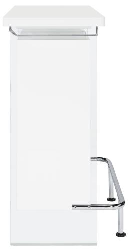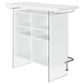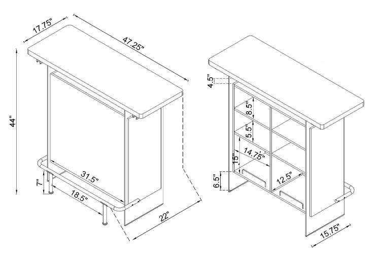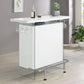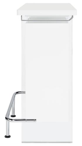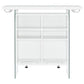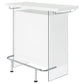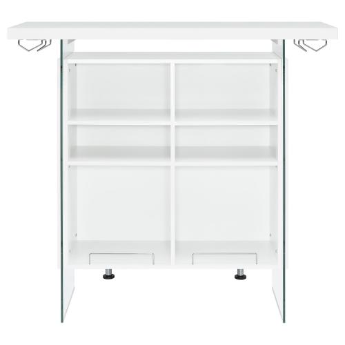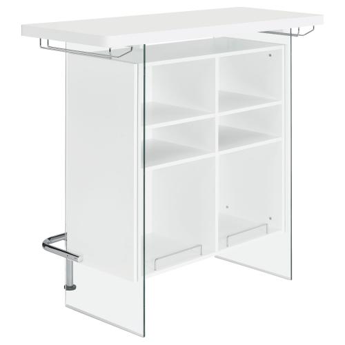 Elevate a multipurpose living room with this modern bar unit. A neutral finish, accented with polished chrome metal accents offers a striking design contrast. Supported and flanked by clear tempered glass side panels, this bar unit boasts ultra-modern elements as well for a dramatic feel. Compact yet highly functional, this bar unit also features ample storage space with six built-in open shelves for storing bottles, serving pieces and other mixologist must-haves. Tucked beneath the bar top along each side is a stemware rack for wine glasses and more.