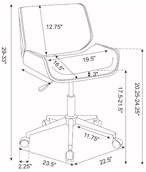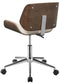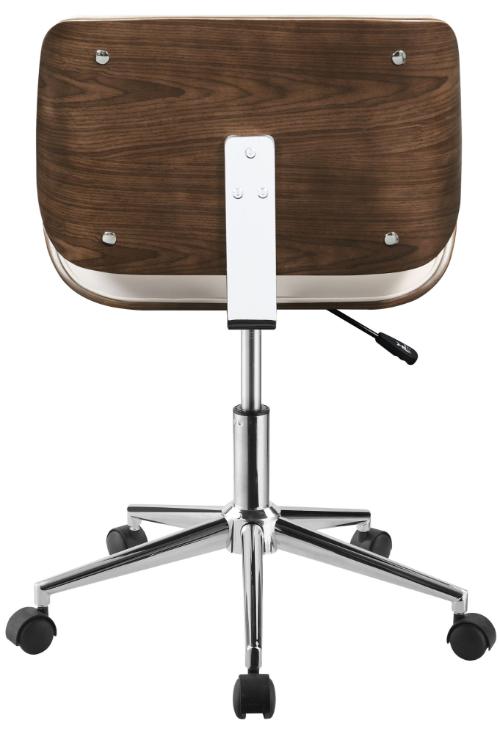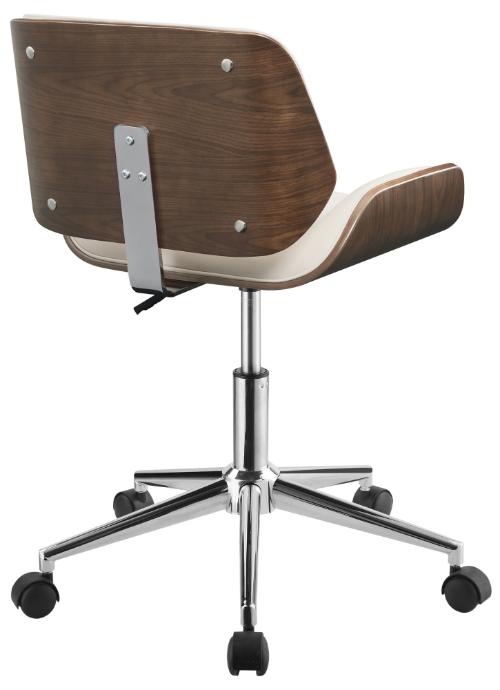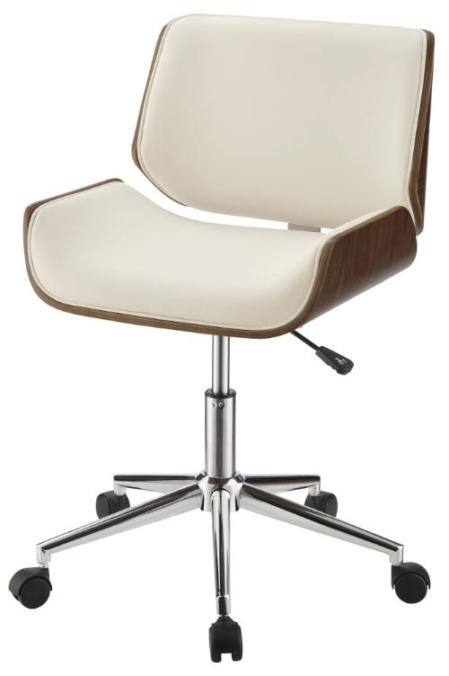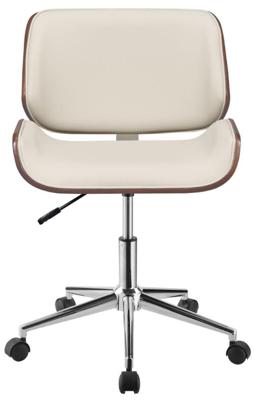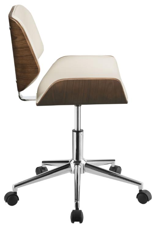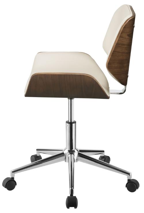 Stay true to a classic retro look. Delivering exceptional comfort, this office chair is a perfect blend of mid-century and modern styling. Tasteful elegance follows a clean, low-profile silhouette with a curved, padded seat and a gently curved seat back. Enjoy a lush palette with ecru leatherette upholstery and walnut and chrome trim. Adjustable seat positions and caster wheels add to its utility with custom seating and portability.