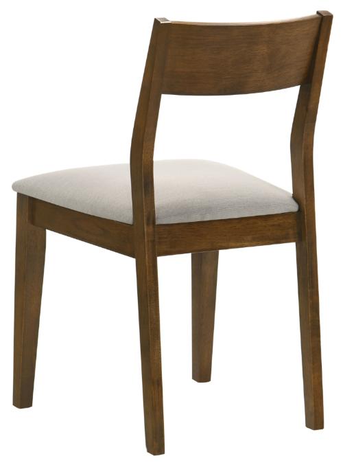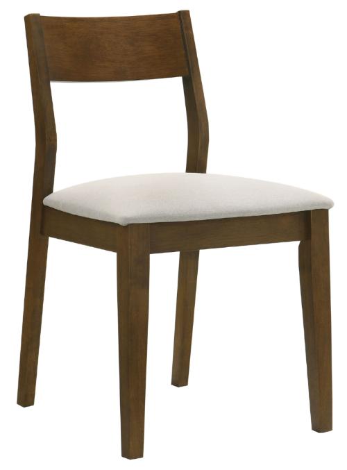 Create a refined but approachable ambiance in your dining room or kitchen with a modern rectangular dining set. Designed for a stylish but grounded look and feel, it centers on a stylish table with angular details. Its chamfered edge pairs with an almost faceted look to create engaging angularity. A dark brown wood finish complements hardwood construction, while chairs are adorned with foam seat cushions and beige upholstery for stylish contrast. The design is complete with cut corners on the tabletop and open chair backs that add visual detail and depth without overwhelming your space.