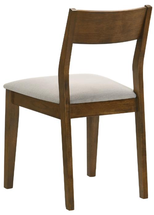 Create a refined but approachable ambiance in your dining room or kitchen with a modern rectangular dining set. Designed for a stylish but grounded look and feel, it centers on a stylish table with angular details. Its chamfered edge pairs with an almost faceted look to create engaging angularity. A dark brown wood finish complements hardwood construction, while chairs are adorned with foam seat cushions and beige upholstery for stylish contrast. The design is complete with cut corners on the tabletop and open chair backs that add visual detail and depth without overwhelming your space.
