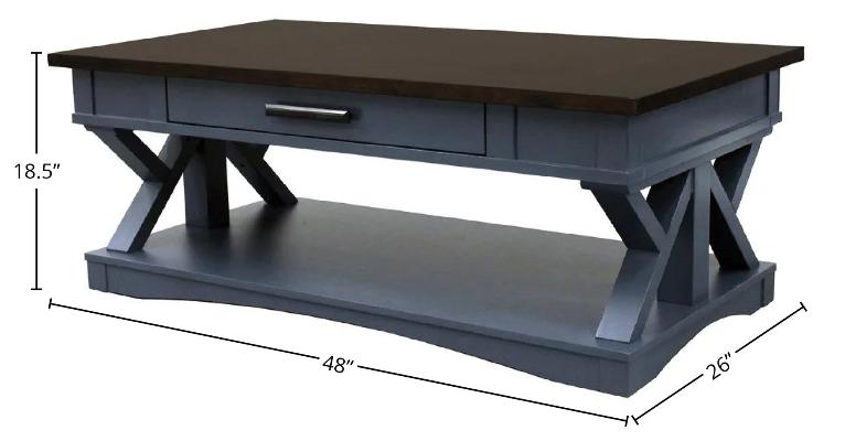 Destined to be the heart of any conversation area, the Americana Modern Cocktail Table is a must-have. Crafted in a denim finish, it features a contrasting wood-grain top in Sable. A lower open area is perfect for storage and display while a center drawer and crossbeam design touches give it endless appeal.