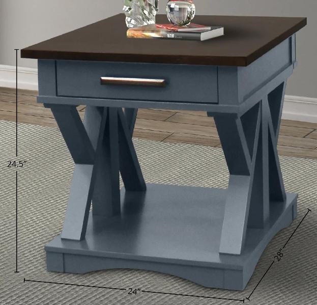 The Americana Modern End Table is where fun meets function. Its classic design character is highlighted in a denim finish and features a contrasting wood-grain top in Sable. The open area below is perfect for storage while its center drawer and crossbeam silhouette create a stunning visual.