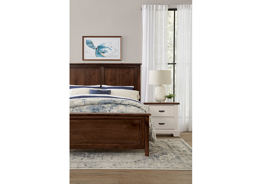 The Amish bed features a framed two panel headboard with clean lines and simple angles. With rustic cherry; we have left in many of the cherry knots to accentuate the unique grain pattern only found in American cherry lumber.