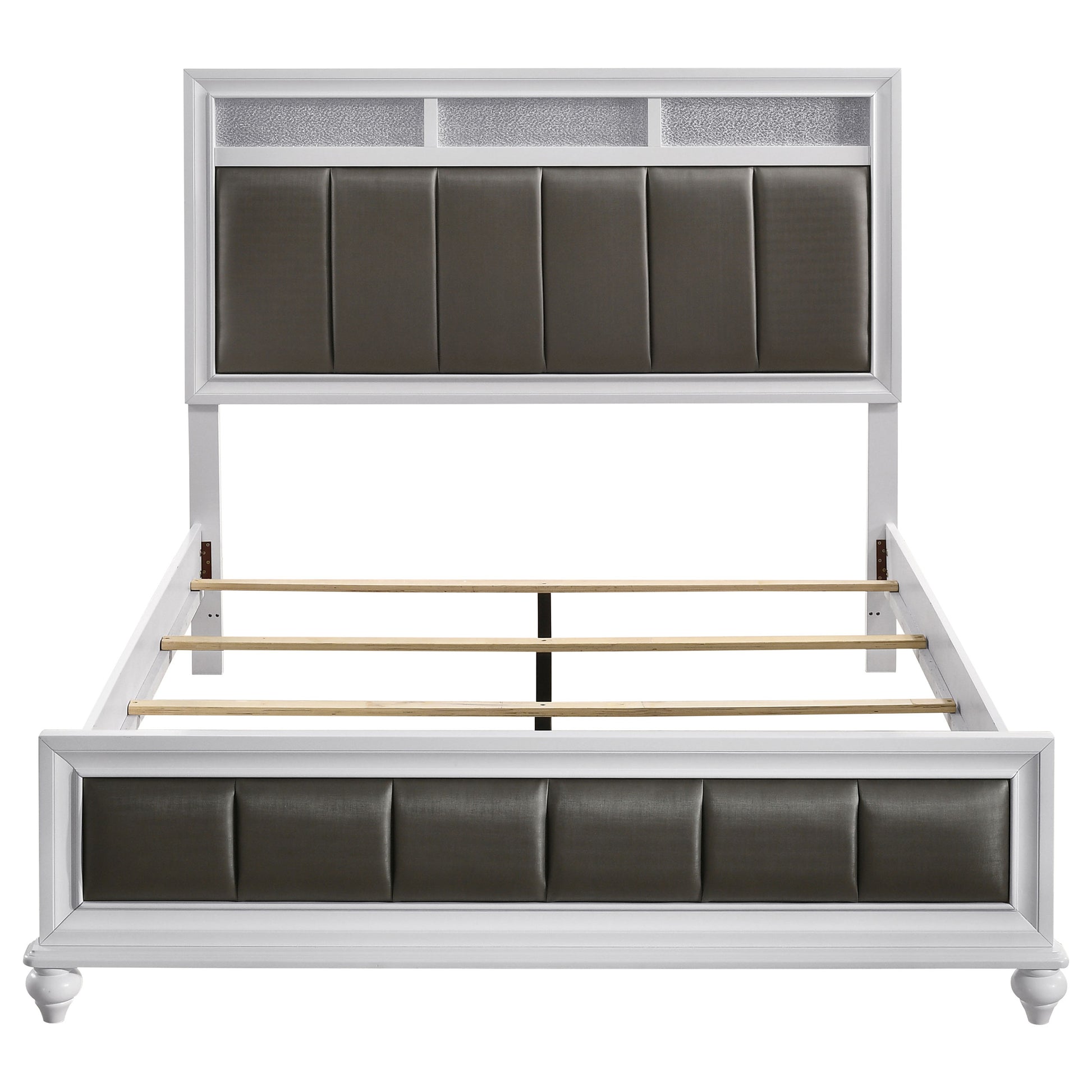 • Eastern king panel bed in white with metallic leatherette upholstered panels