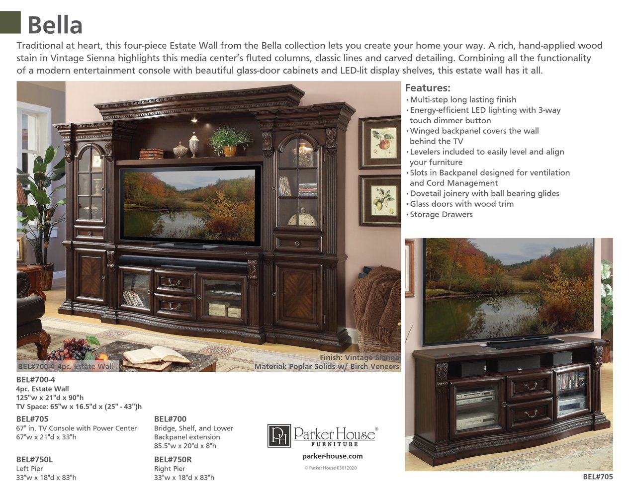 Traditional at heart, this four-piece Estate Wall from the Bella collection lets you create your home your way. A rich, hand-applied wood stain in Vintage Sienna highlights this media center's fluted columns, classic lines and carved detailing. Combining all the functionality of a modern entertainment console with beautiful glass-door cabinets and LED-lit display shelves, this estate wall has it all.