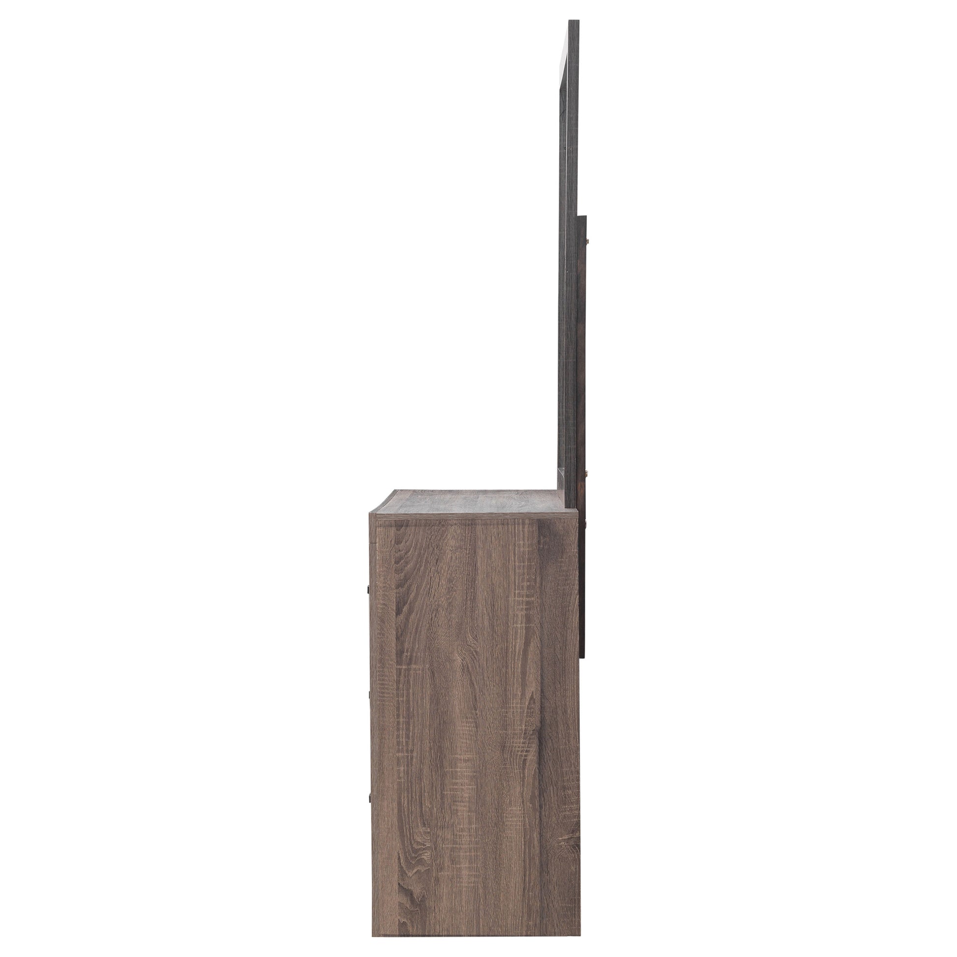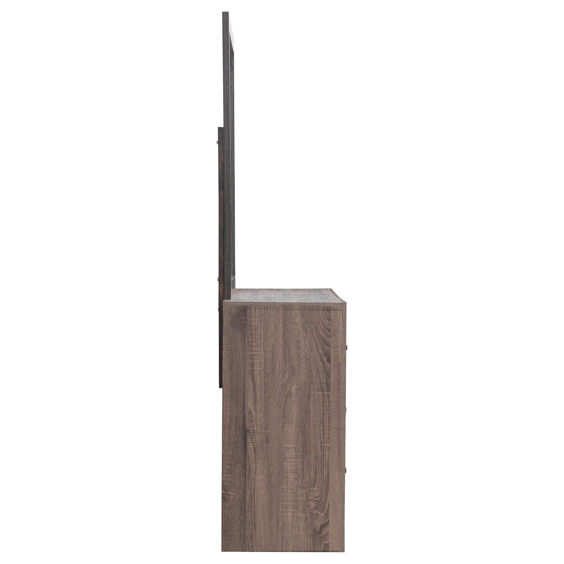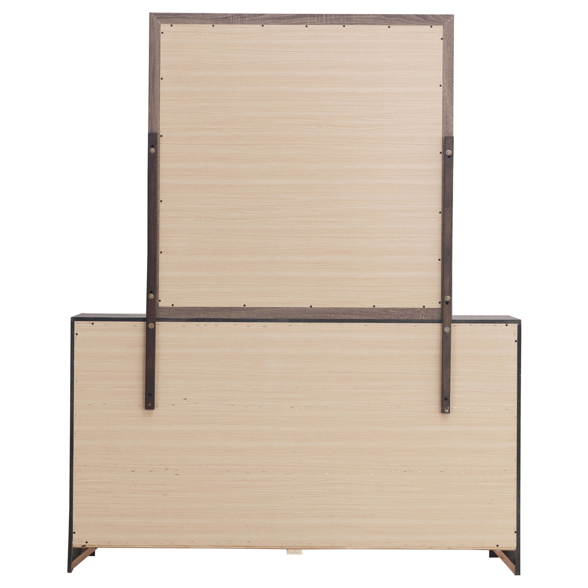 This dresser and mirror set offers a blend of modern design and practical storage. The six-drawer dresser provides ample space for clothing and essentials, while the matching mirror enhances depth and brightness in any room. Crafted from engineered wood with a durable laminate veneer, this set is built for long-term use. Matte dark bronze handles contrast against the sleek frame, adding a refined touch to its contemporary aesthetic.
