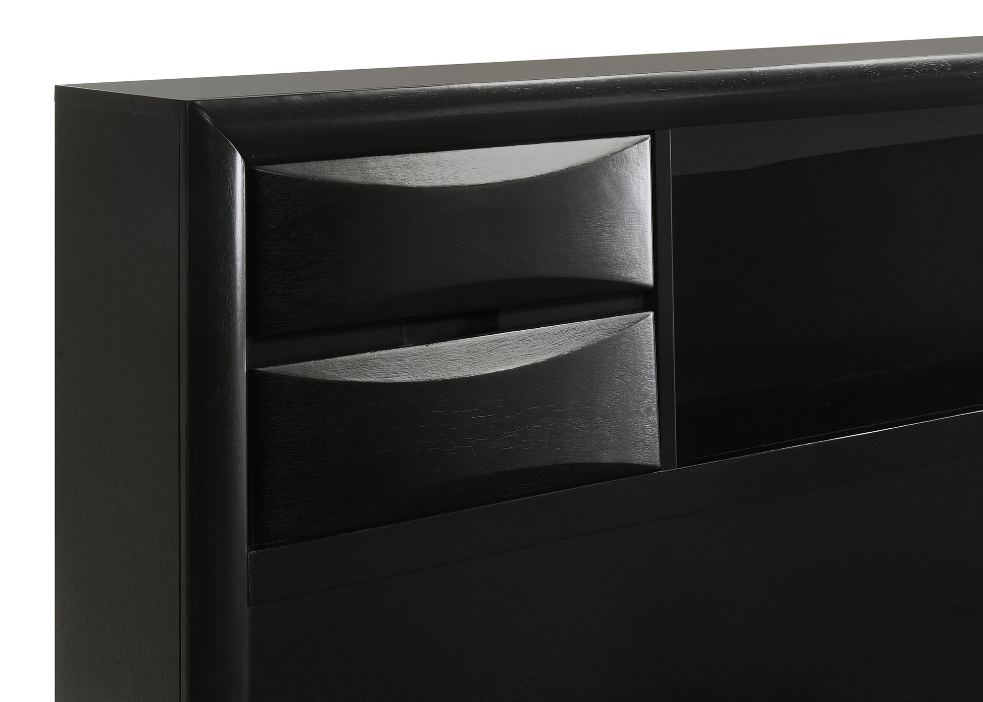 Elevate your bedroom with this modern bookcase storage platform bed finished in rich black. Thoughtfully designed for style and utility, it features four drawers in the headboard, four in the footboard, and convenient drop-down doors along the side rails for easy storage access. The bookcase headboard includes open shelving for books or décor, combining practicality with sleek design. Crafted from rubberwood, engineered wood, and okume veneer, this platform bed delivers lasting quality and eliminates the need for a foundation.