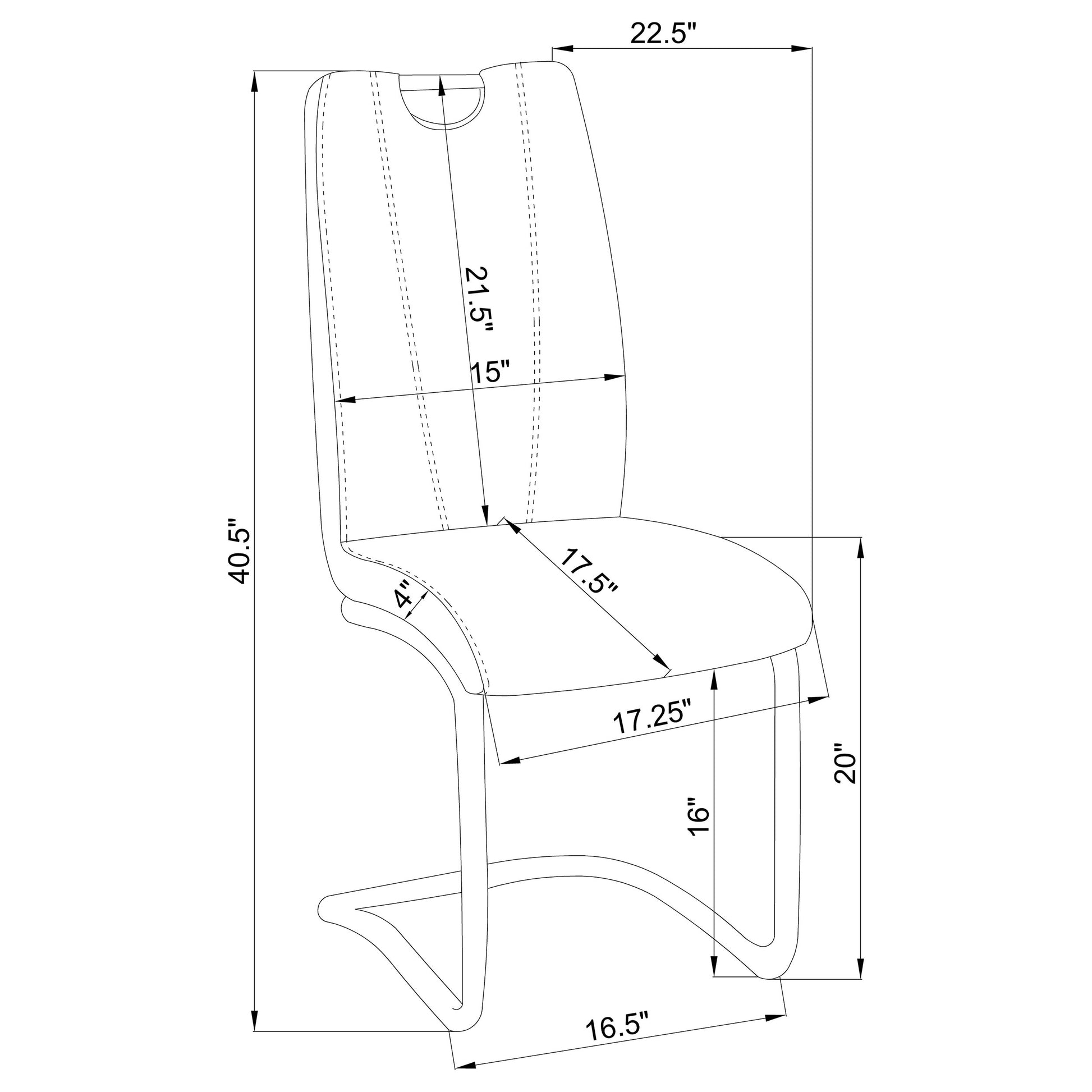 Give your entertainment area an ultra-modern feel with this five-piece dining table set. A spacious rectangular table with a gleaming high gloss white finish is supported by three stainless steel supports in a lustrous chrome finish that rest on a flush base that mirrors the top. With a pedestal-like design, the dining table invites each of the four cantilever style dining chairs to slide up for meals and conversations. Sit back and rest in the upholstered seats, wrapped in a two-tone gray and white leatherette that accents the contoured shapes. Mounted on a polished chrome metal base, the cantilever design chairs also offer an open, airy feel that showcases the table.