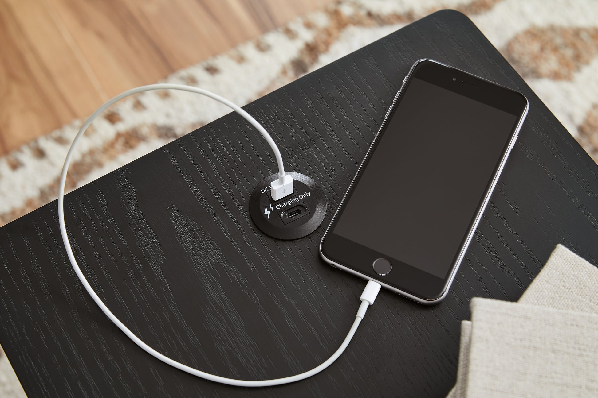 | Details | Made with hardwood solids, veneers and engineered wood, Rich black wood grain finish, Integrated drawer handles, 3 curved-front drawers, USB-A and USB-C charging, Power cord included; UL Listed | |