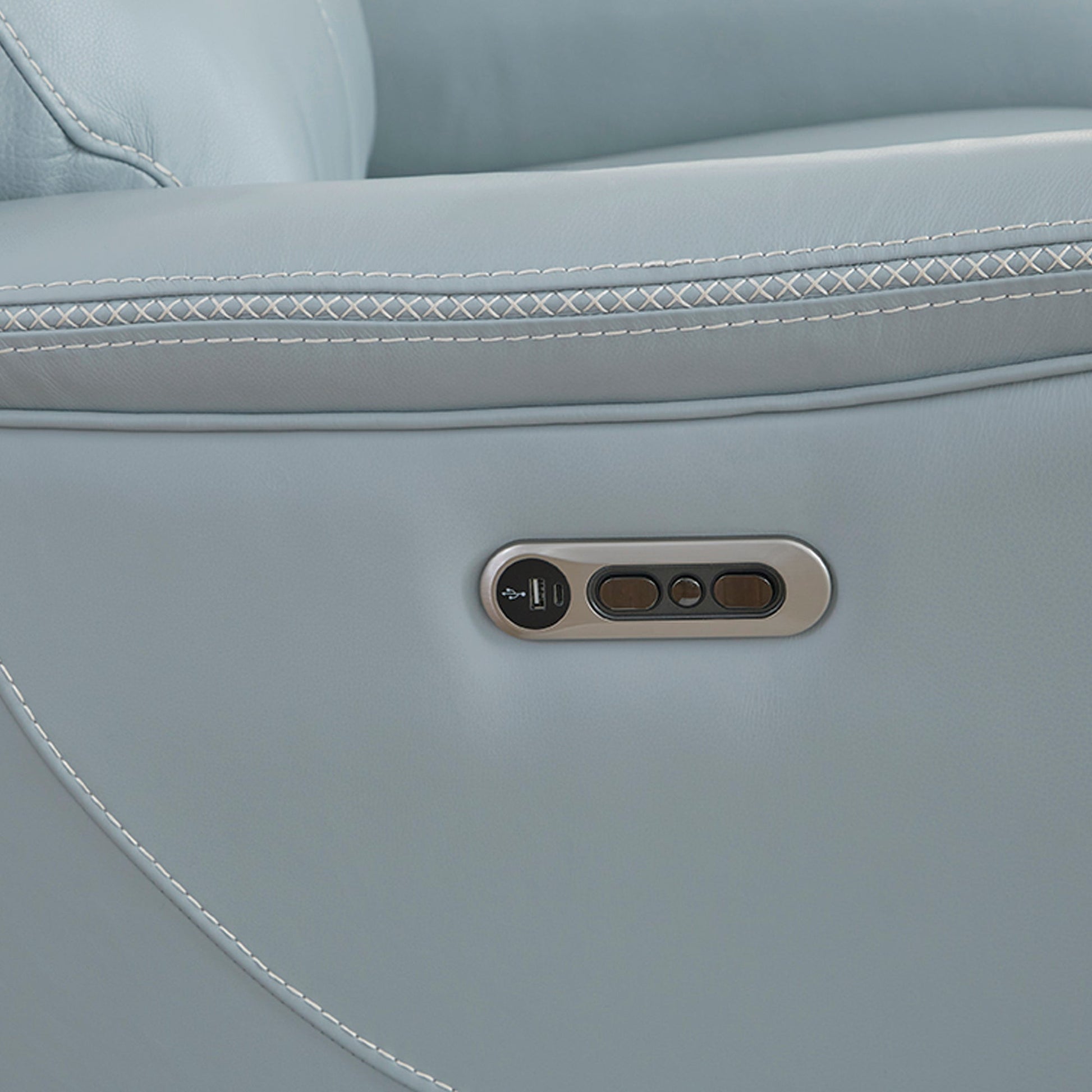 The Cascade Power Sofa Group creates a serene escape in the comfort of your living area. Its neutral pale blue-grey color tone relaxes the eyes while its contemporary tapered pad over the arms adds a refreshing take on these classic silhouettes. Power headrests and decorative baseball stitching converge throughout this gorgeous glove soft leather collection, delighting the senses at every turn.