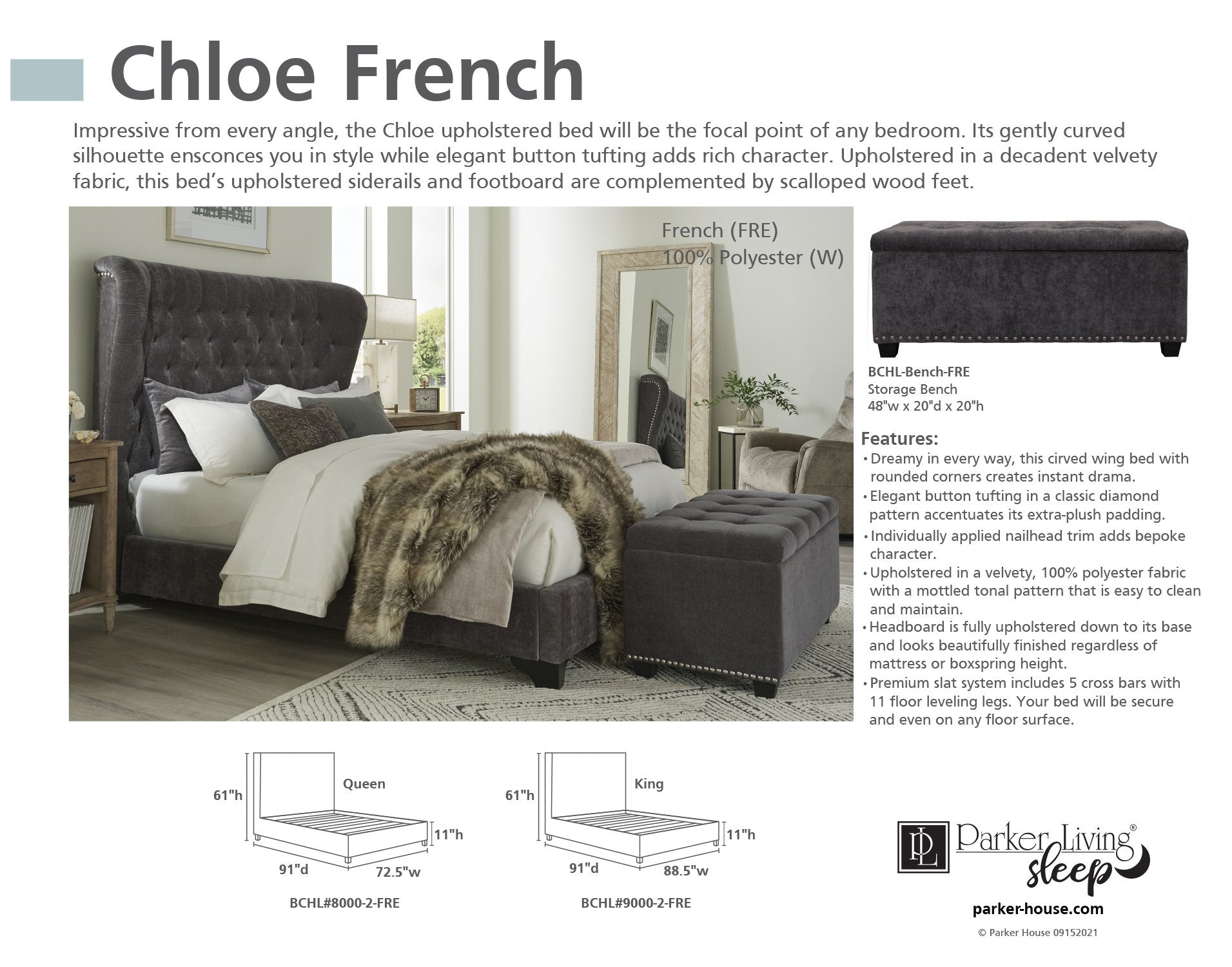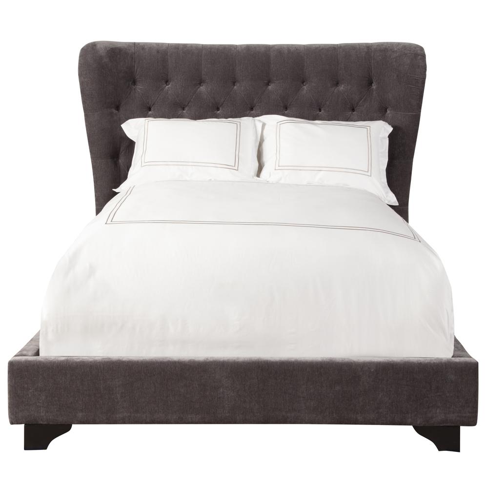 Impressive from every angle, the Chloe upholstered bed will be the focal point of any bedroom. Its gently curved silhouette ensconces you in style while elegant button tufting adds rich character. Upholstered in a decadent velvety fabric, this bed’s upholstered siderails and footboard are complemented by scalloped wood feet.