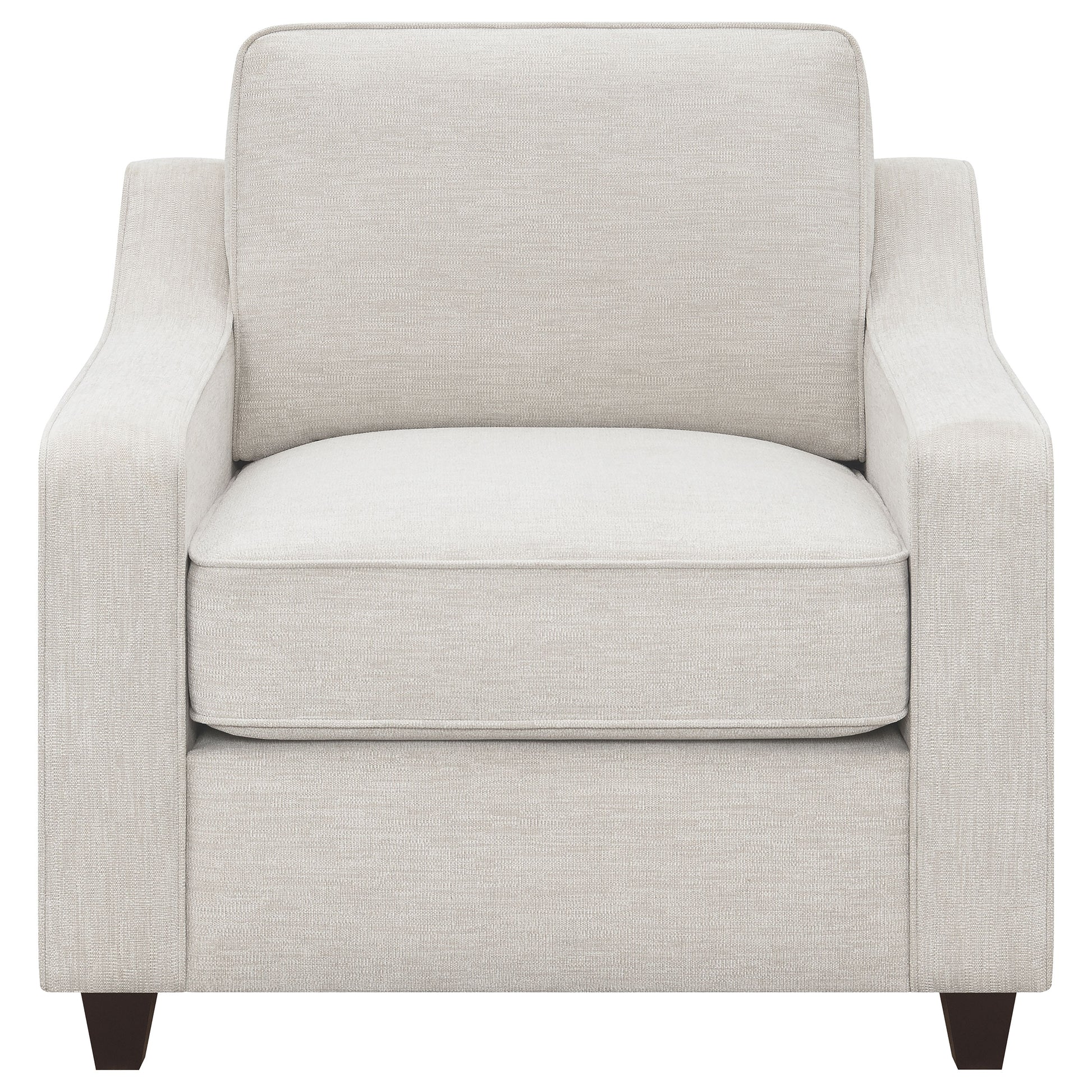 Wrapped in a cheerful, beige woven chenille upholstery, this seating set exudes a look of sophistication. Sloped track arms add elegant lines while tapered dark brown legs add a striking contrast. Understated yet regal, this transitional seating set works inside farmhouse and contemporary style homes effortlessly. Dense and plush boxed seat and back cushions feature classic welt details, as coral and copper tone accent pillows lend a boho-like tough. Add this upholstered furniture set into a space for a subtle chic aesthetic.