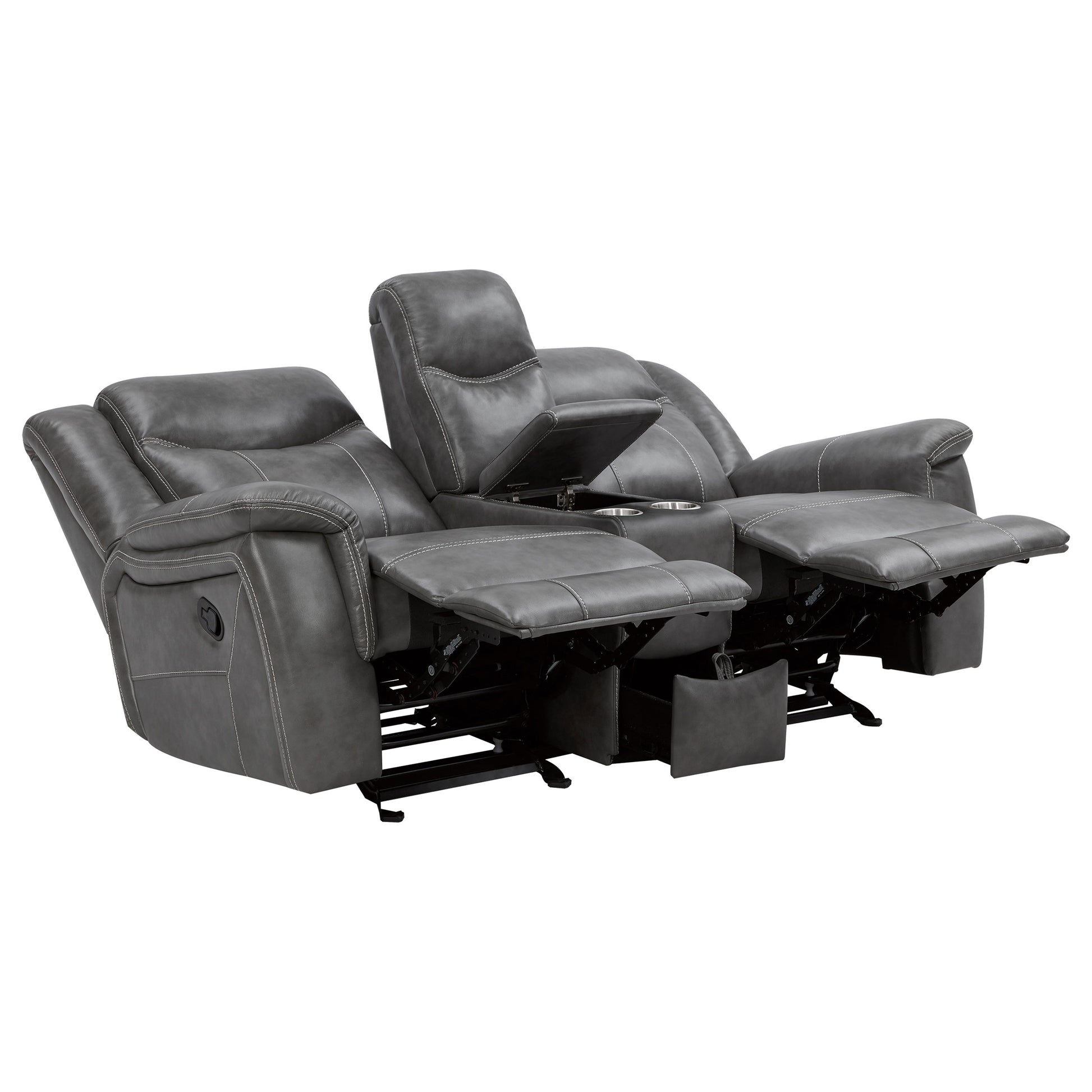 Experience superior comfort and modern convenience with this glider reclining loveseat upholstered in smooth grey faux leather. Designed with plush padded seats, headrests, and armrests, it offers a relaxing and supportive feel. The centre console includes two stainless steel cup holders, a soft-close lift-top compartment with dual AC and USB ports, and a lower storage drawer for added functionality. With a one-inch cool gel memory foam topper, this loveseat delivers lasting comfort and effortless style.