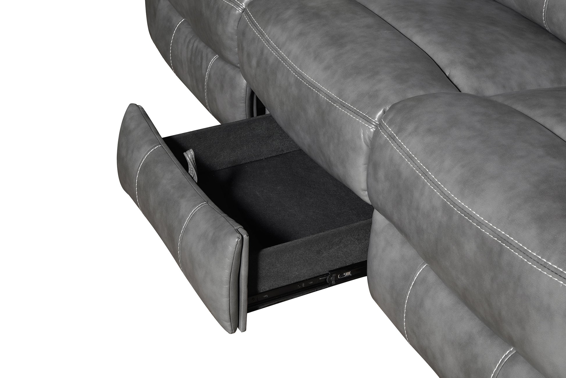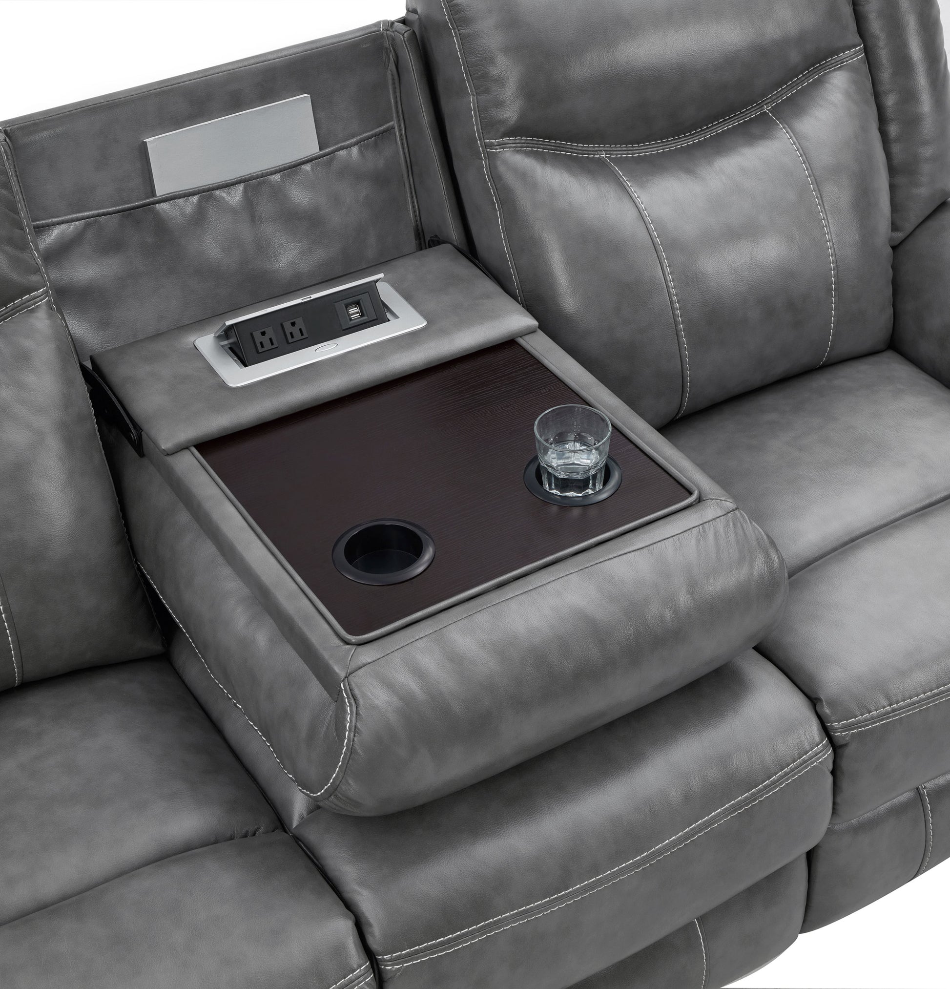 Bring luxury and convenience to your living room with this reclining sofa upholstered in smooth grey faux leather. Designed with plush padded seating, headrests, and armrests, it ensures exceptional comfort. The drop-down centre table reveals dual cup holders, a pop-up power outlet with two AC and two USB ports, and a hidden storage drawer for added practicality. A wall-hugger mechanism saves space, while a one-inch cool gel memory foam topper enhances softness for an upgraded lounging experience.
