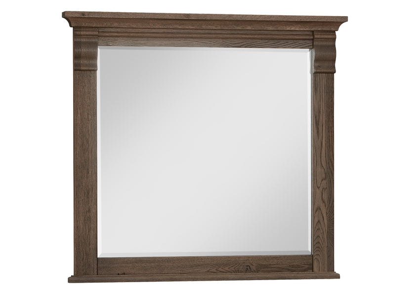 Complete your bedroom collection by placing this mirror on top of your dresser or chest. Featuring a frame crafted from solid oak and beveled glass; Heavy Corbel molding at the top