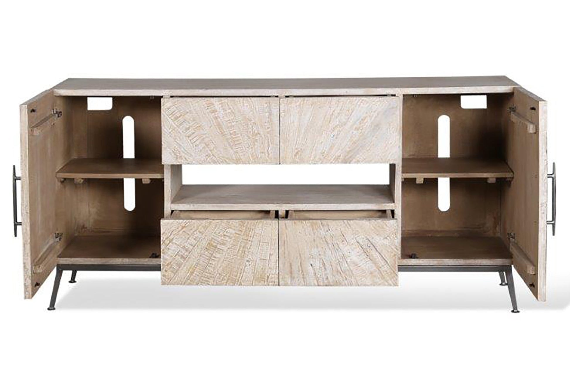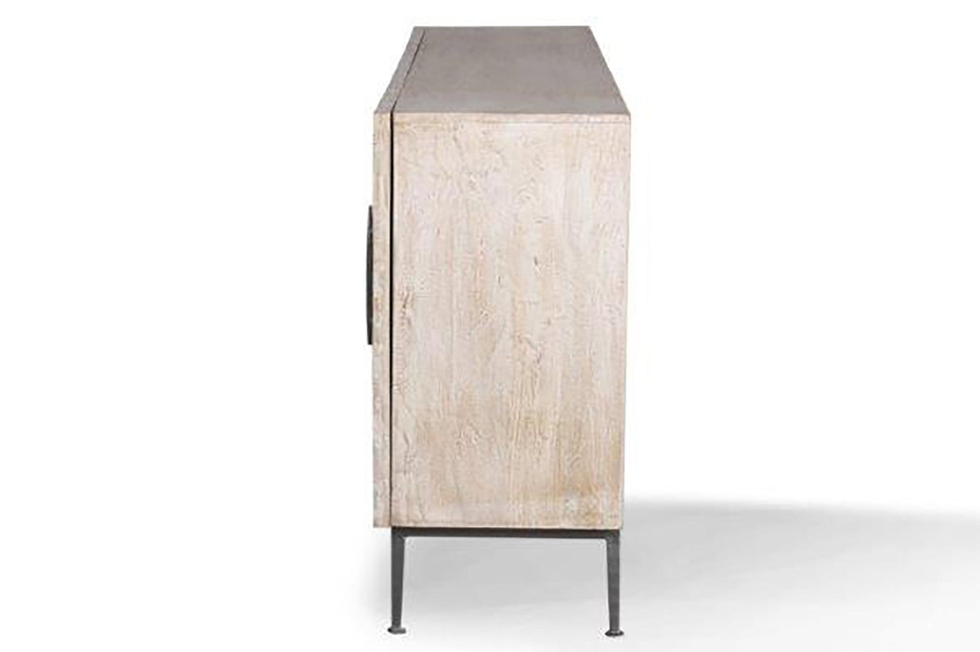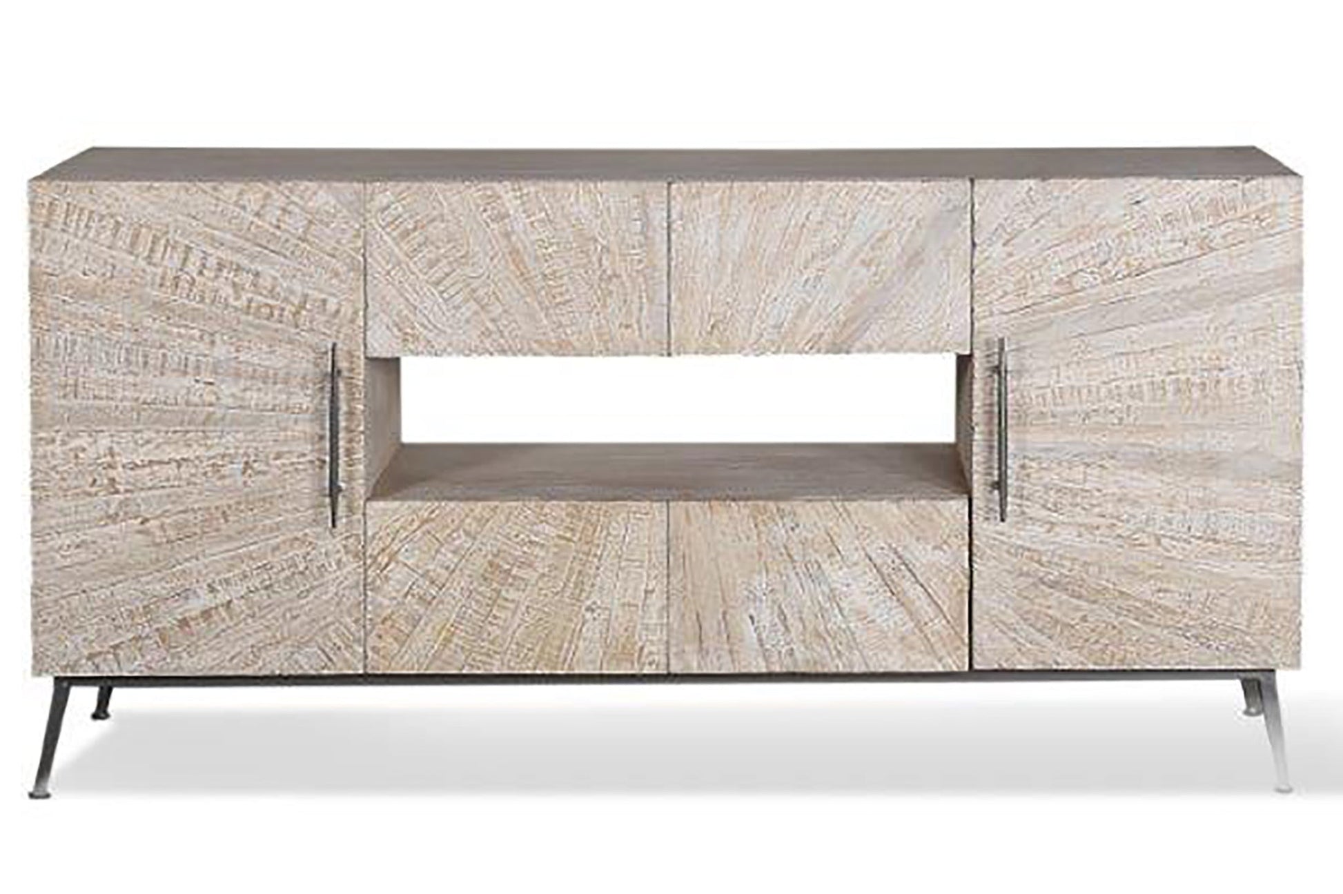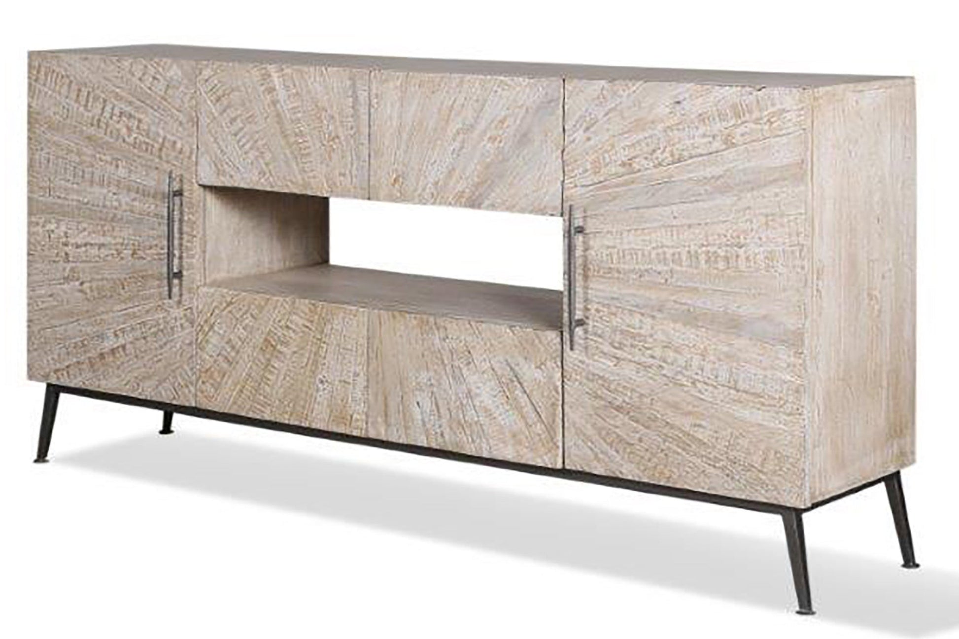 The details on this functional console adds a clean elegant feel that will add conversation to your space with ease. The multi-step sand-blasted weathered Blanc finish gives the feel of pebbled sands on the French Rivera. The two front doors and four centered drawers have planked mango wood that radiate outward creating a touch of visual interest. Solid iron slayed base and hardware add a detail of contrast to the mango wood. Open center design and wire management add functionality to this beautiful design.