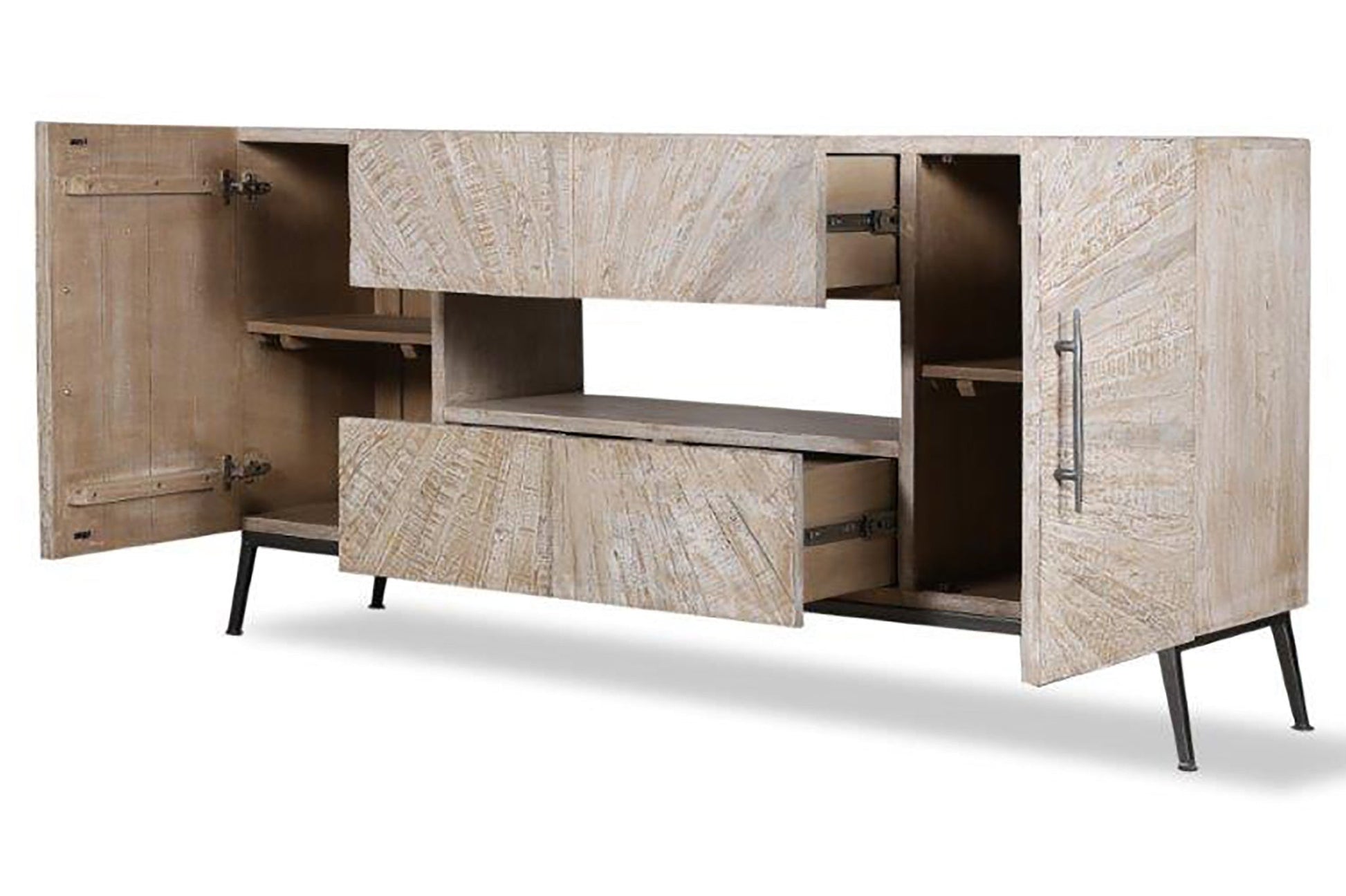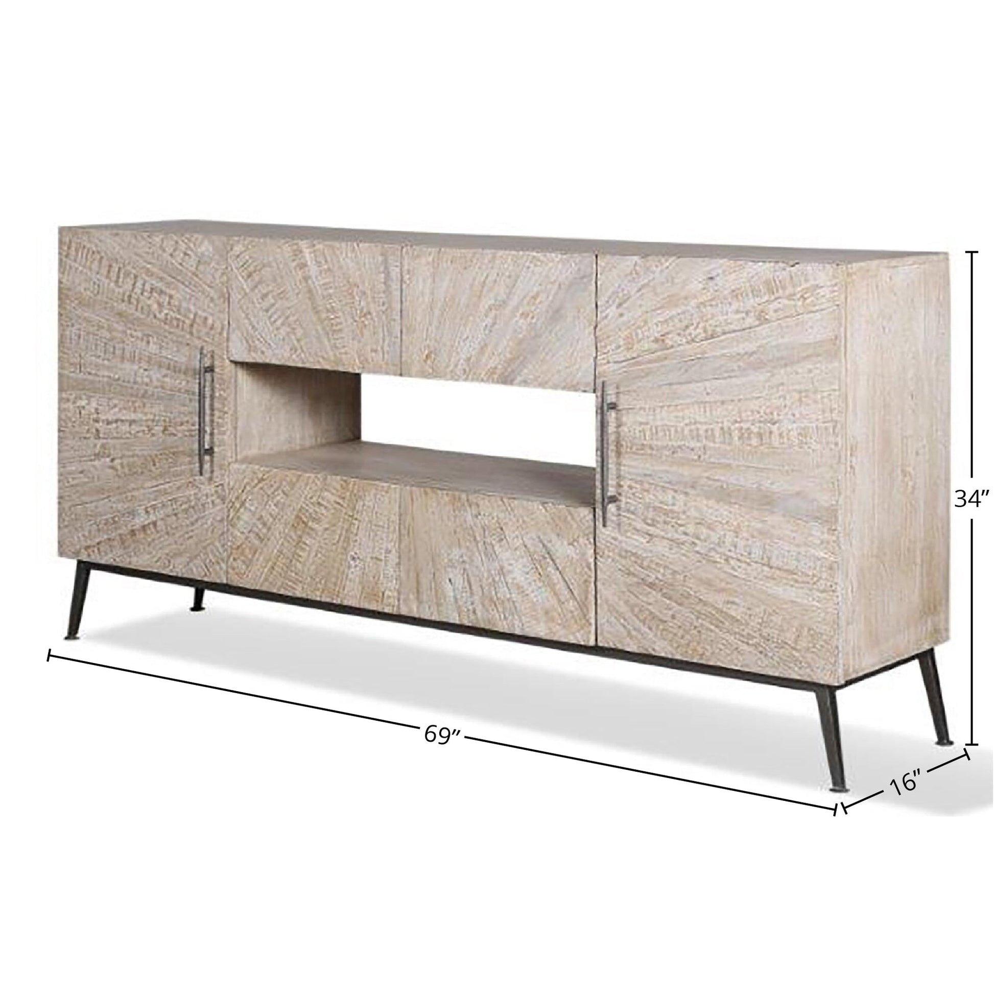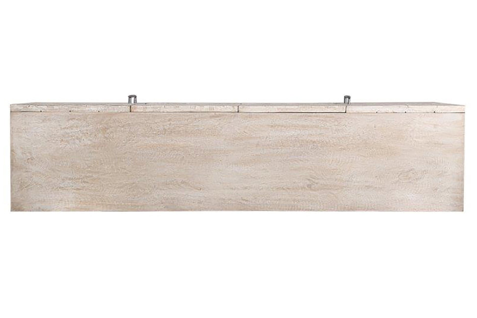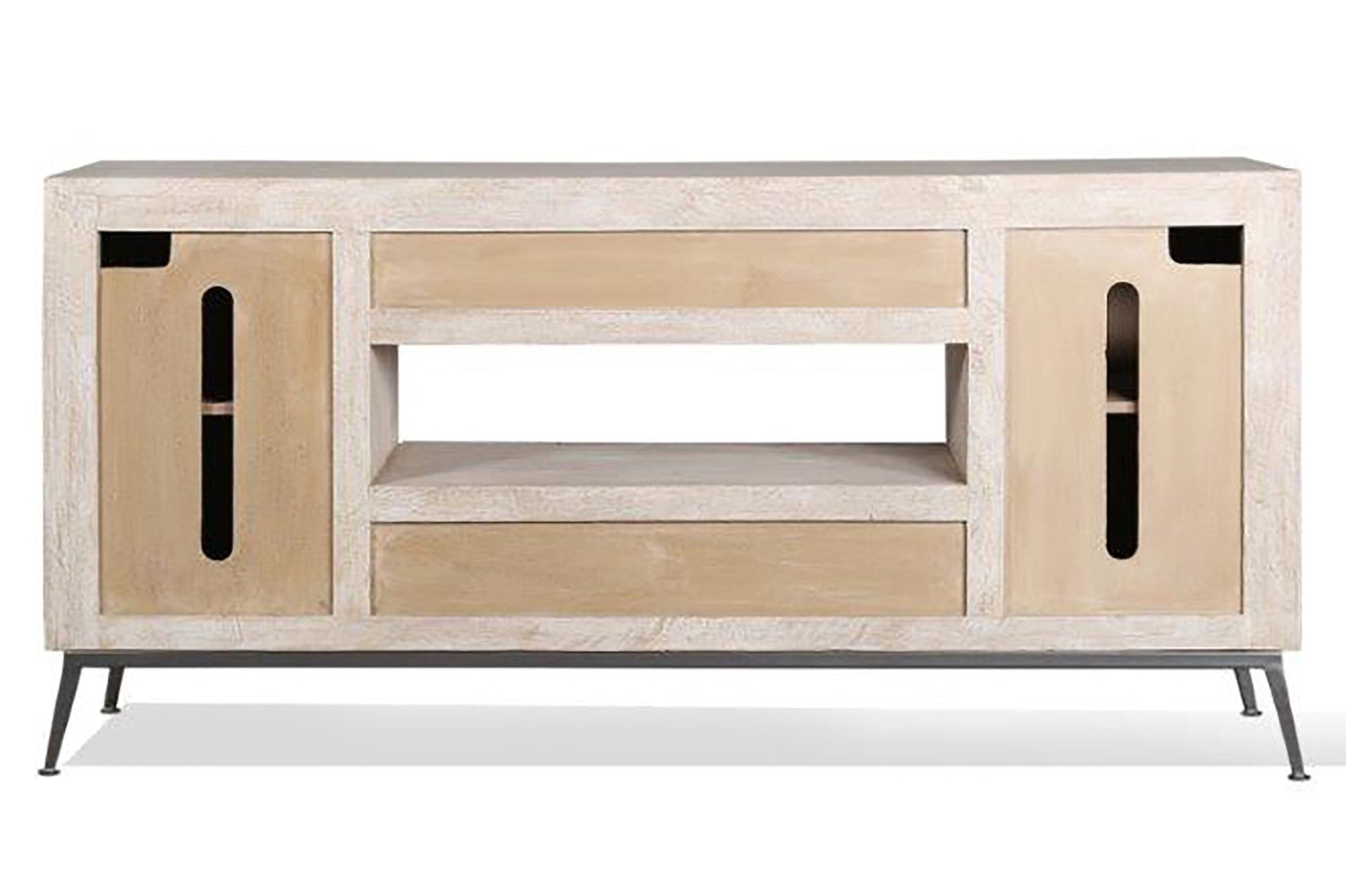 The details on this functional console adds a clean elegant feel that will add conversation to your space with ease. The multi-step sand-blasted weathered Blanc finish gives the feel of pebbled sands on the French Rivera. The two front doors and four centered drawers have planked mango wood that radiate outward creating a touch of visual interest. Solid iron slayed base and hardware add a detail of contrast to the mango wood. Open center design and wire management add functionality to this beautiful design.