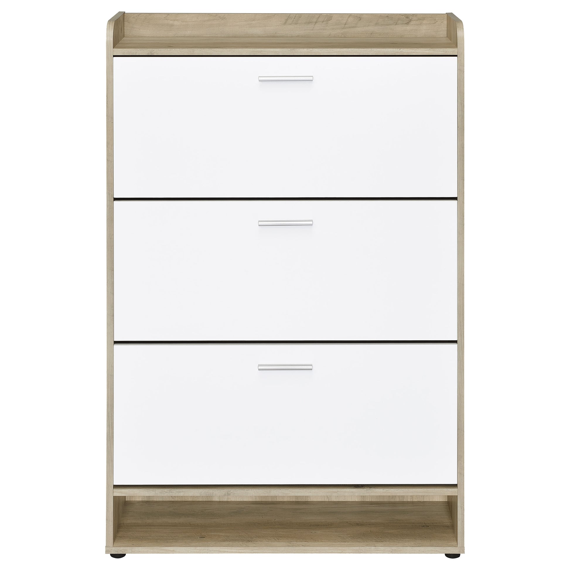 Elevate the organization of your entryway with our dual-tone shoe cabinet, a harmonious blend of practicality and contemporary design. This chic cabinet, crafted from robust engineered wood with a realistic wood-look laminate, offers three tiers of shelving for your footwear, each promising to keep your space clutter-free. The sleek top serves as a perfect perch for your decorative touches or daily essentials, while an additional compartment at the base discreetly takes care of extra storage needs. This cabinet seamlessly adapts to your home's aesthetic, ensuring style and function walk hand in hand.