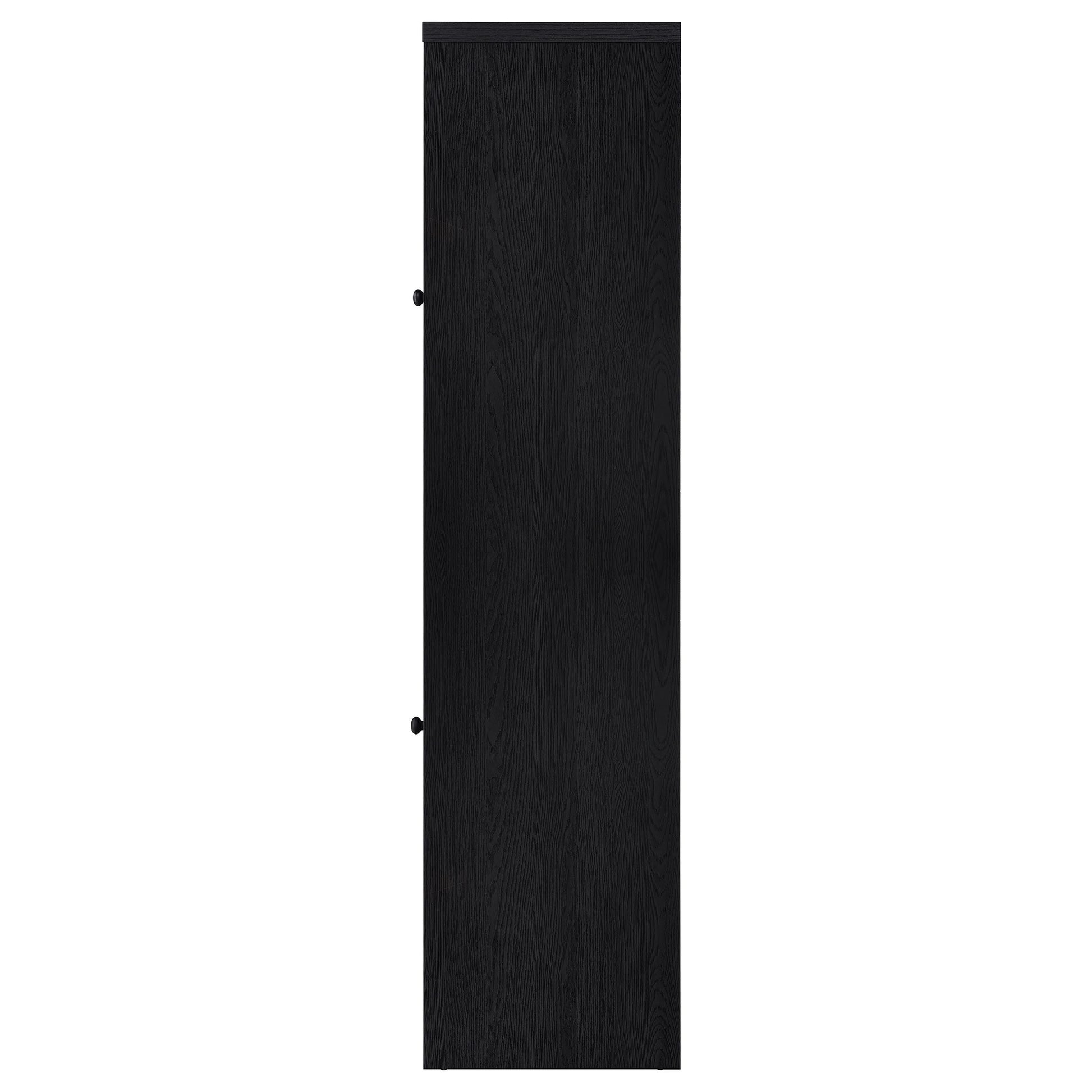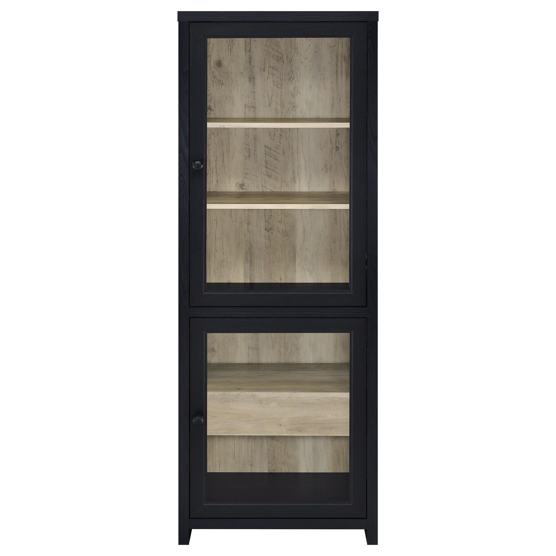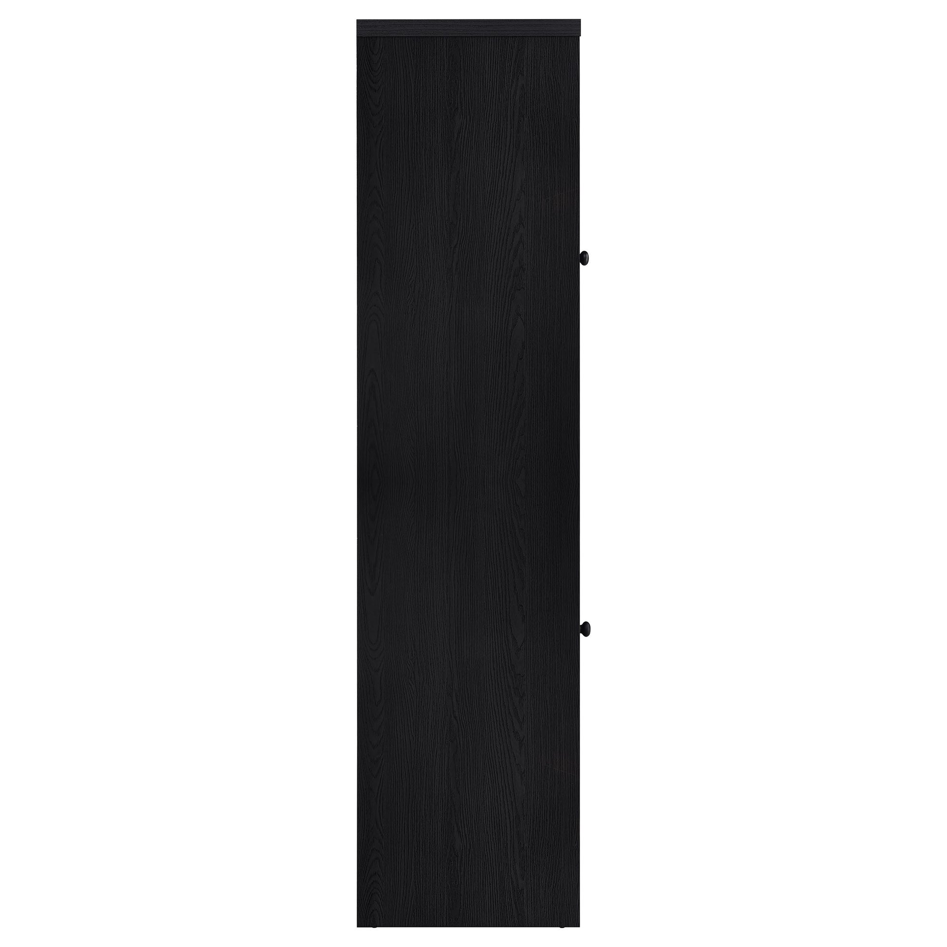Elevate your space with a media tower that blends quiet elegance and thoughtful design. Wrapped in a bold black finish, this two-door cabinet reveals a rich interior contrast and graceful utility. Framed glass doors showcase your favorite pieces above, while a hidden drawer below offers a secret haven for everyday essentials. Whether you're curating a display or storing away the everyday, this tall, slender silhouette adds a refined presence to any corner it inhabits.