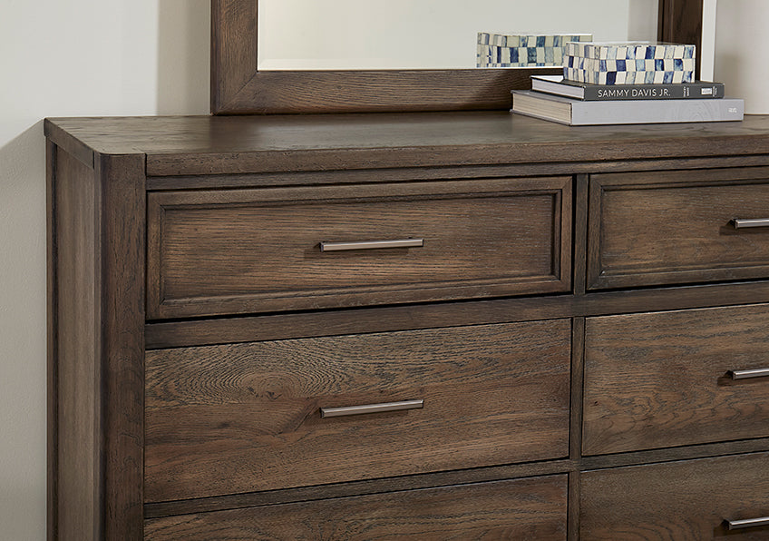 Crafted Oak Bedroom Collection by Ben + Erin Napier Host of HGTV's Hometown. 58 inch 8 drawer master dresser with all the splits; cracks; knot holes – all of the aging and refining that can only be provided by Mother Nature herself.