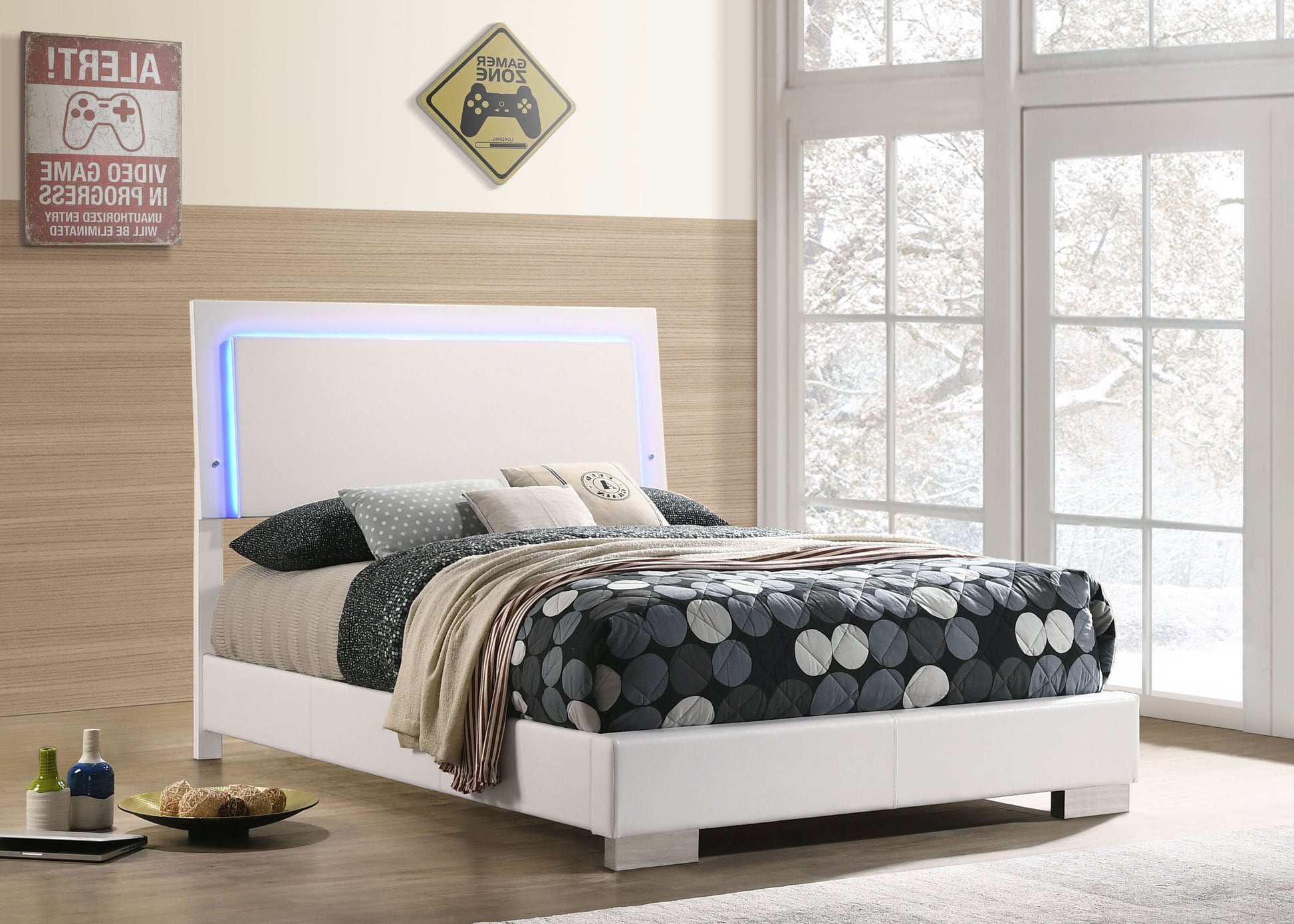 • Panel bed featuring a sleek, modern LED headboard design