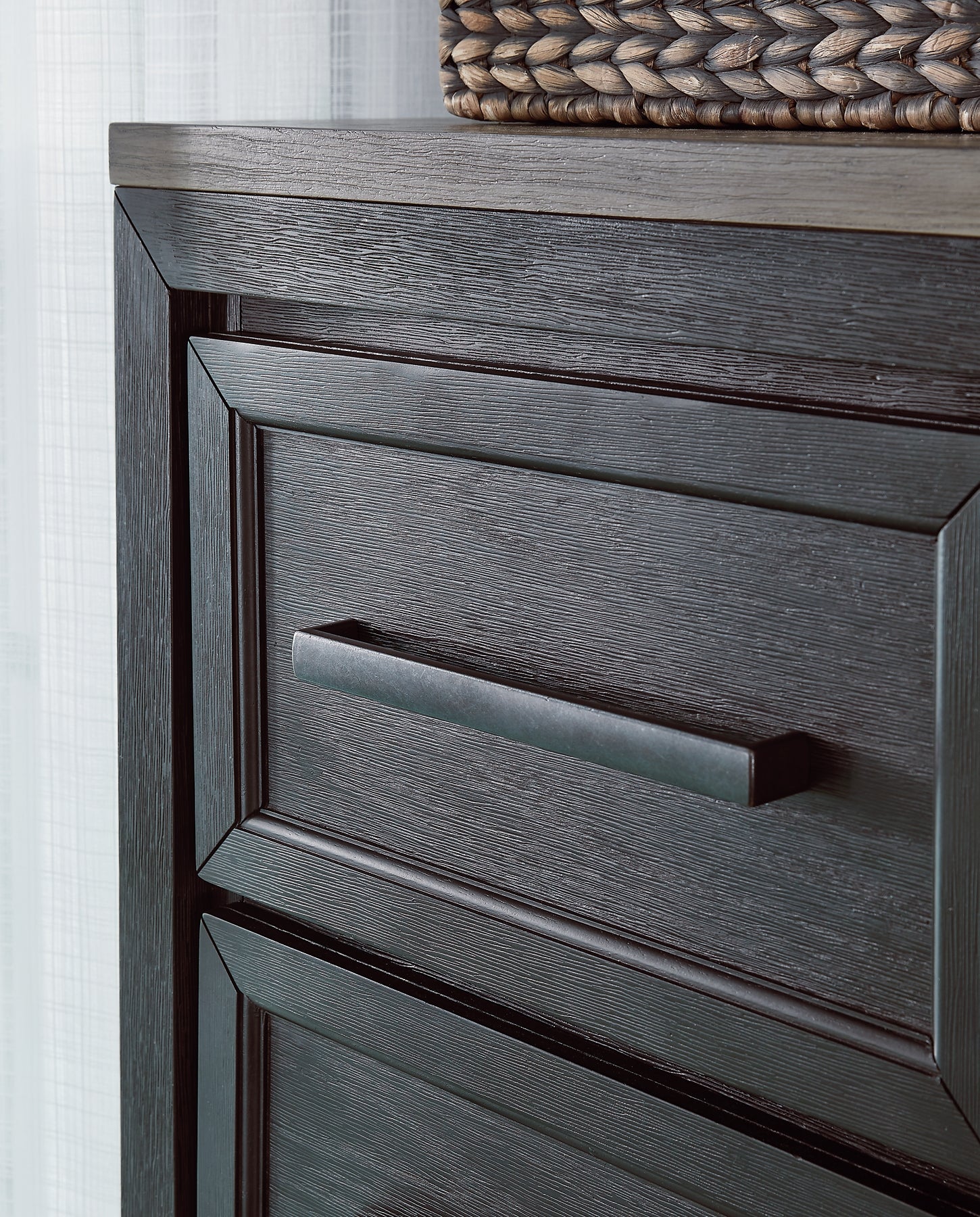 | Details | Includes dresser and mirror, Made with hardwood solids, select oak veneers and engineered wood, Two-tone finish (brushed black and dusty grayish brown wood tone), Sleek drawer pulls with black finish, 11 soft-close, smooth-gliding drawers with fully finished interiors and dovetail construction (top drawers felt lined), 5 drawers with brushed black finish; 6 drawers with grayish brown wood tone, 3 drawers located behind each door, Mirror mounts to back of dresser, Assembly required | |