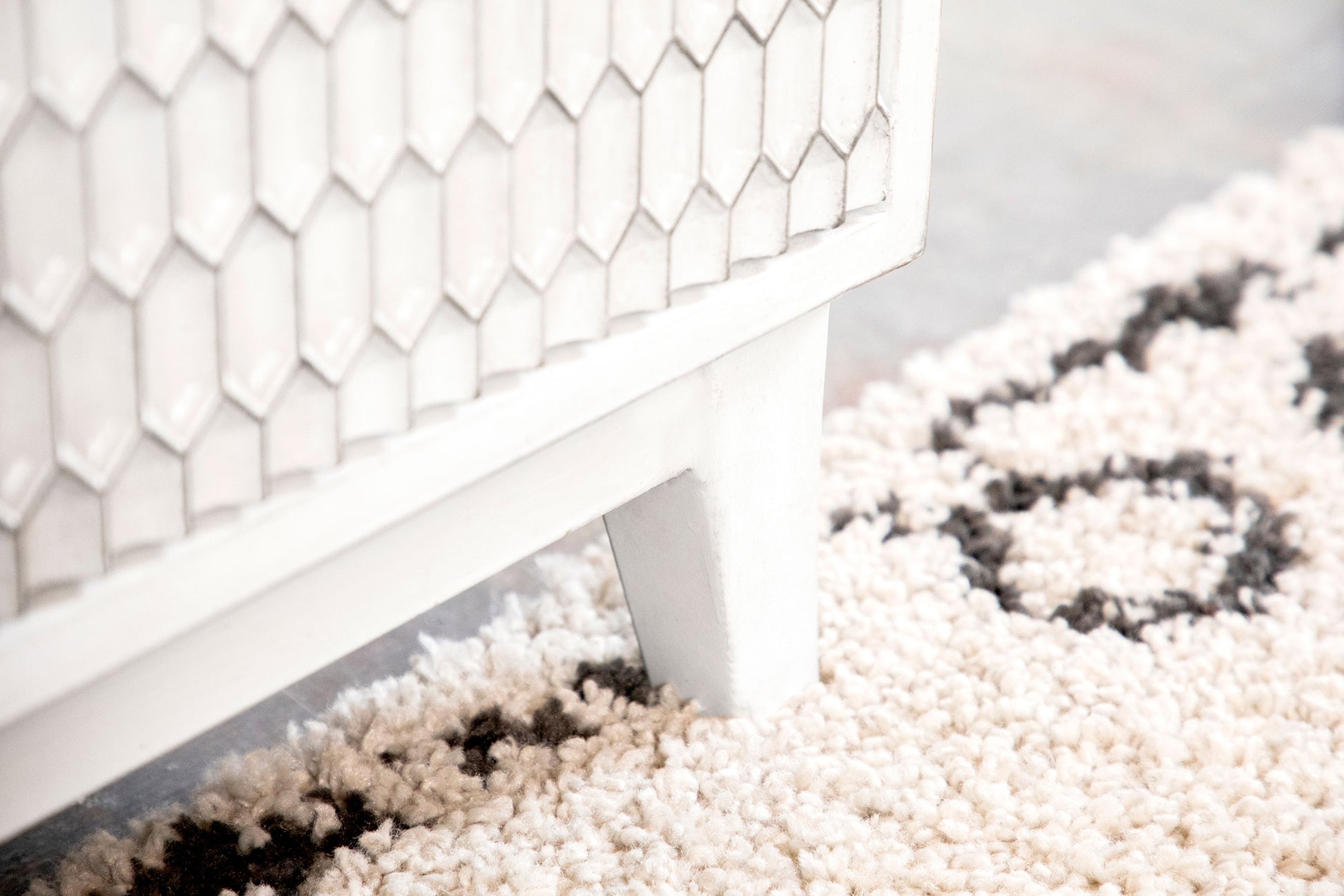 This two-door cabinet adds subtle charm with its crisp white finish and sculpted geometric door fronts. The raised honeycomb-inspired texture brings dimension and interest to the façade, while lightly distressed edging offers a softly weathered touch. Inside, an adjustable shelf allows for flexible storage. Its clean lines and sculptural surface make this cabinet an ideal accent for transitional, coastal, or eclectic interiors.