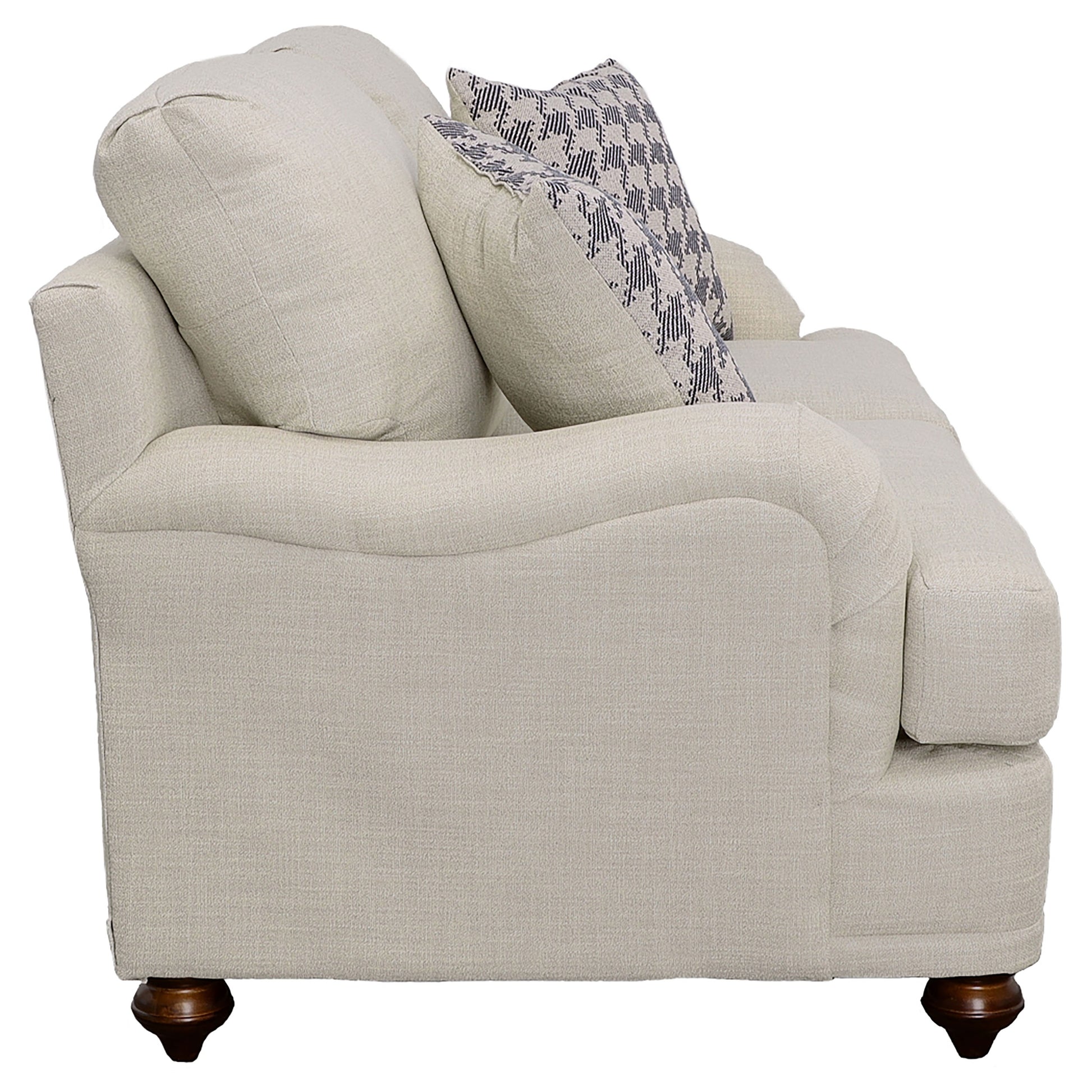 Taking a page from cottage-style farmhouse ambiance, this two-piece sofa and loveseat set wins over family and guests with its elegant simplicity. With tailored English arms and turned legs offering a contrasting espresso finish, each piece of this set shines with a light grey linen-like upholstered cover. Reversible cushions with T-cushions on each end create comfort and stay in shape, as a solid wood frame with a sinuous spring deck sets the stage for durability. Attached back cushions remain stationary to prevent shifting. Enjoy the designer look of seven accent pillows with varying blue print covers.