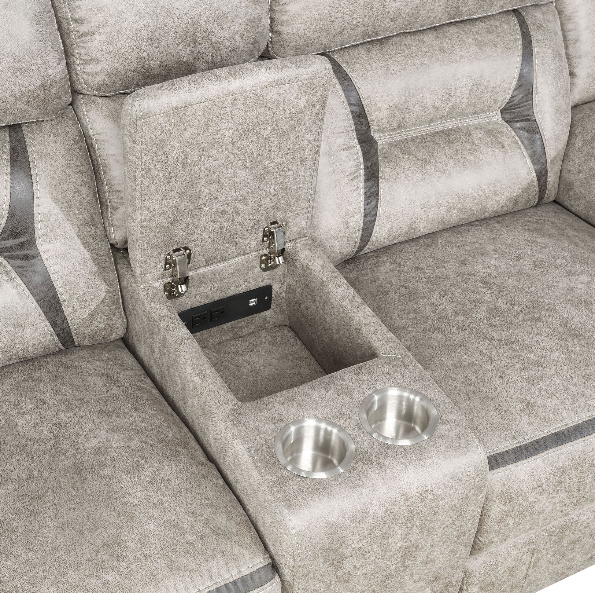 This glider loveseat pairs cozy support with clever convenience. Manual reclining seats invite you to unwind as a smooth gliding mechanism soothes between scenes. A center console adds lift-top storage, a pop-up power hub with USB charging, and stainless steel cup holders to keep essentials close. Supportive pocket-coil cushions and memory foam cradle every position. Trim leatherette with contrast stitching covers a durable frame of foam, engineered wood, and heavy gauge metal.