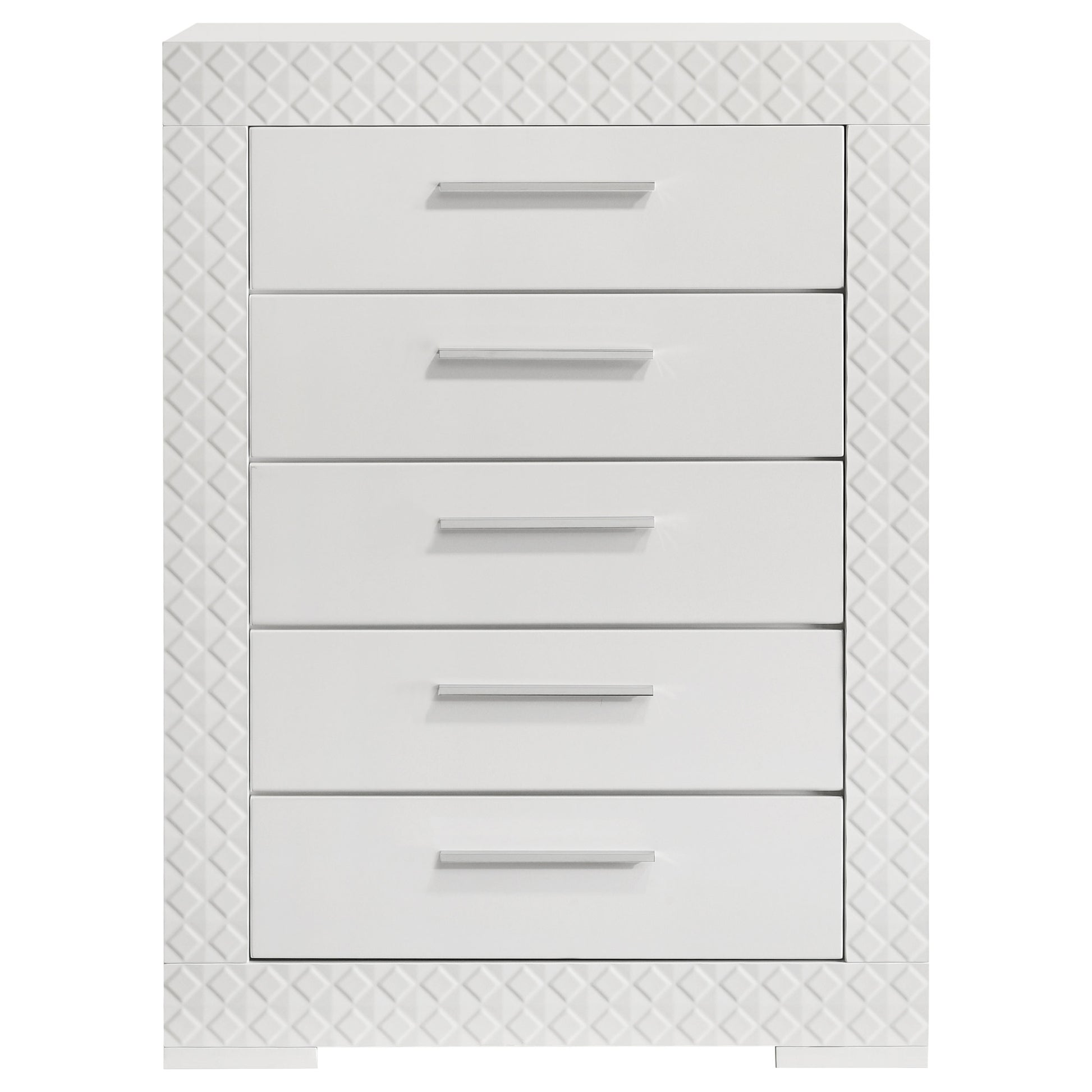 Organize your wardrobe in style with this contemporary chest. The high gloss finish and 3-dimensional diamond tile emboss provide a chic, modern look that enhances any bedroom decor. Five spacious drawers offer ample storage for clothing and linens, each with felt lining in the top drawers to protect your delicate items. The chest is built with robust materials and Pin construction joinery, ensuring durability and smooth functionality. This piece is both practical and stylish, perfect for a modern home.