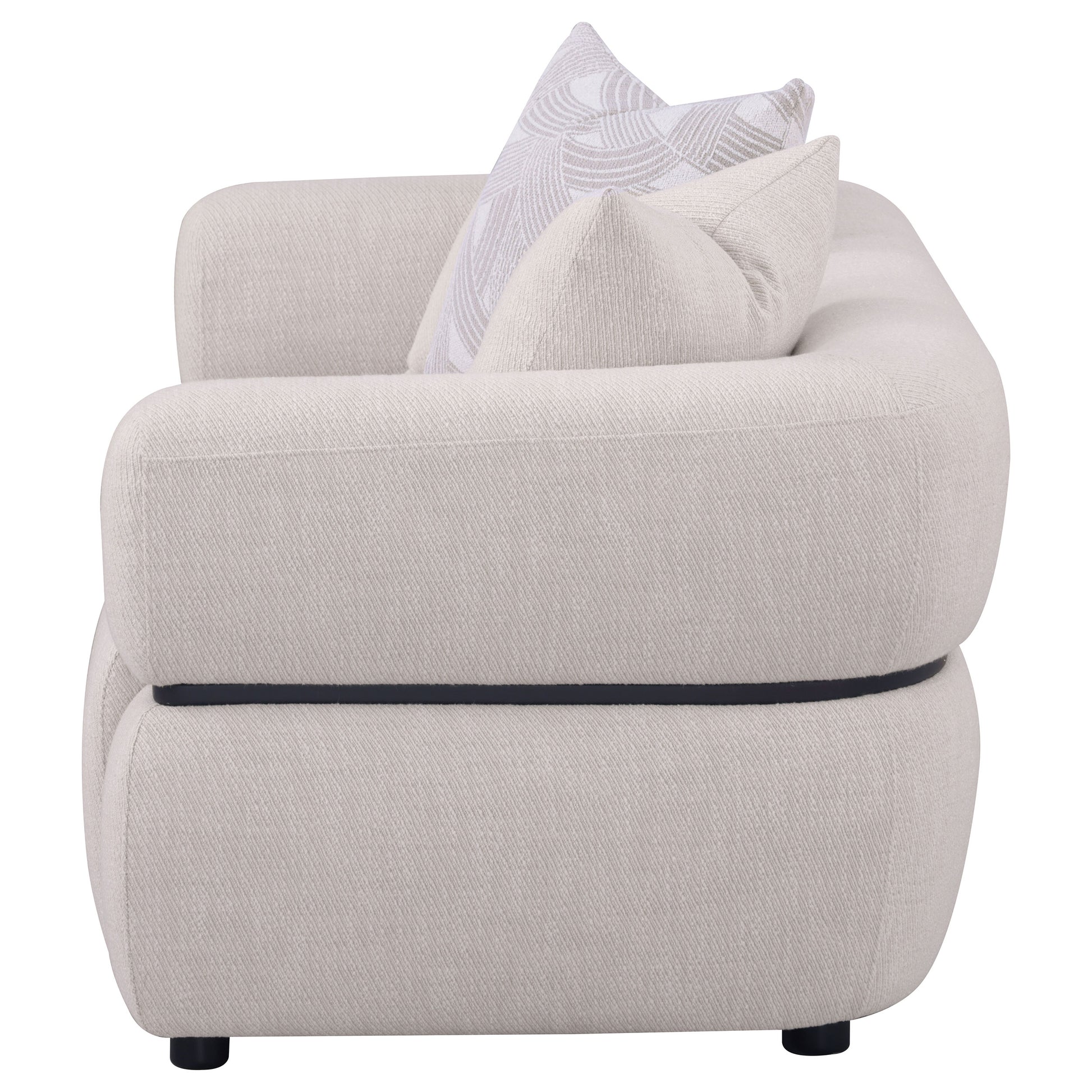 With a striking silhouette and artistic presence, this sculptural loveseat pairs bold form with inviting comfort. A distinctive solid wood waistband traces the frame, emphasizing its contemporary curve. Textured beige upholstery wraps the waterfall bench seat in a tailored embrace, punctuated by plush textured accent pillows. Constructed with pocket coil support for durability, this loveseat becomes an eclectic focal point in modern living spaces.