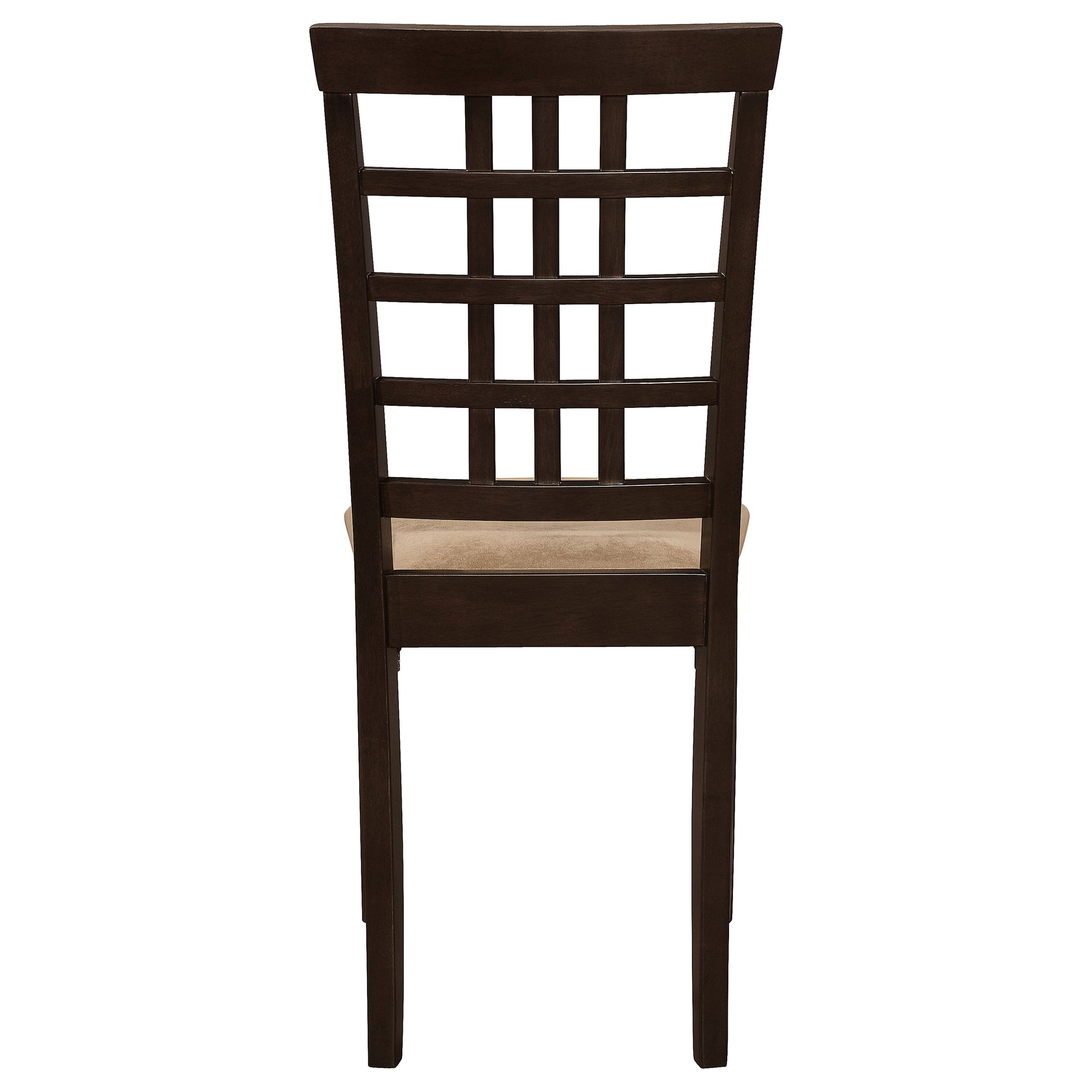 Perfect for compact dining spaces, this three-piece dining set combines warmth and versatility. The rectangular drop-leaf table allows flexible use for everyday meals or small gatherings, crafted in a rich cappuccino finish that enhances its transitional charm. Two matching chairs feature open lattice backs and padded beige microfiber seats for comfort and contrast. Built from solid rubberwood and engineered wood, this dining set balances durability, practicality, and timeless appeal.