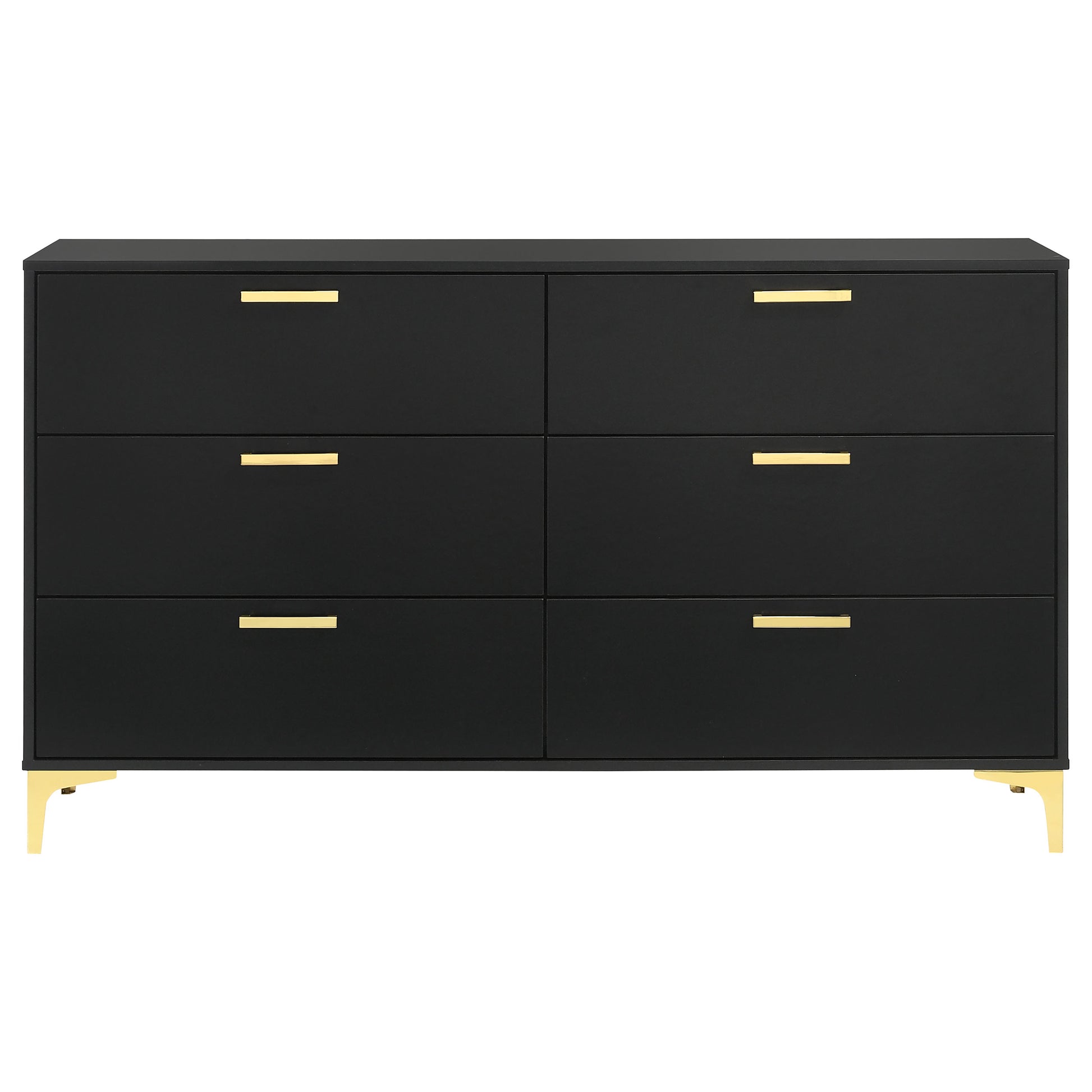 Space-saving and elegantly understated, this modern glam dresser offers plenty of space to store all wardrobe items. A boxy frame with a smooth black finish presents a bold, handsome look and creates a striking focal wall. Six spacious drawers make room for pajamas and garments, keeping your top surface neat and tidy. Each drawer is adorned with a slender gold pull handle that offers a sleek metallic accent. Gold finished bracket legs mirror the hardware, offering a unified look and feel.