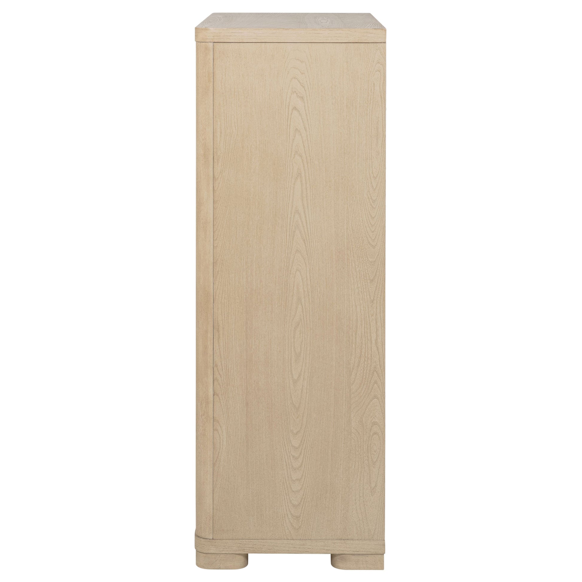 This five-drawer chest offers a balance of style and storage with its light elm finish and brushed nickel fingertip pulls. Rounded corners enhance its sleek design, while extra-large tinted drawers provide ample storage. Built with French dovetail fronts, English dovetail backs, and smooth metal glides, this chest is as durable as it is elegant, making it ideal for compact and modern bedrooms.