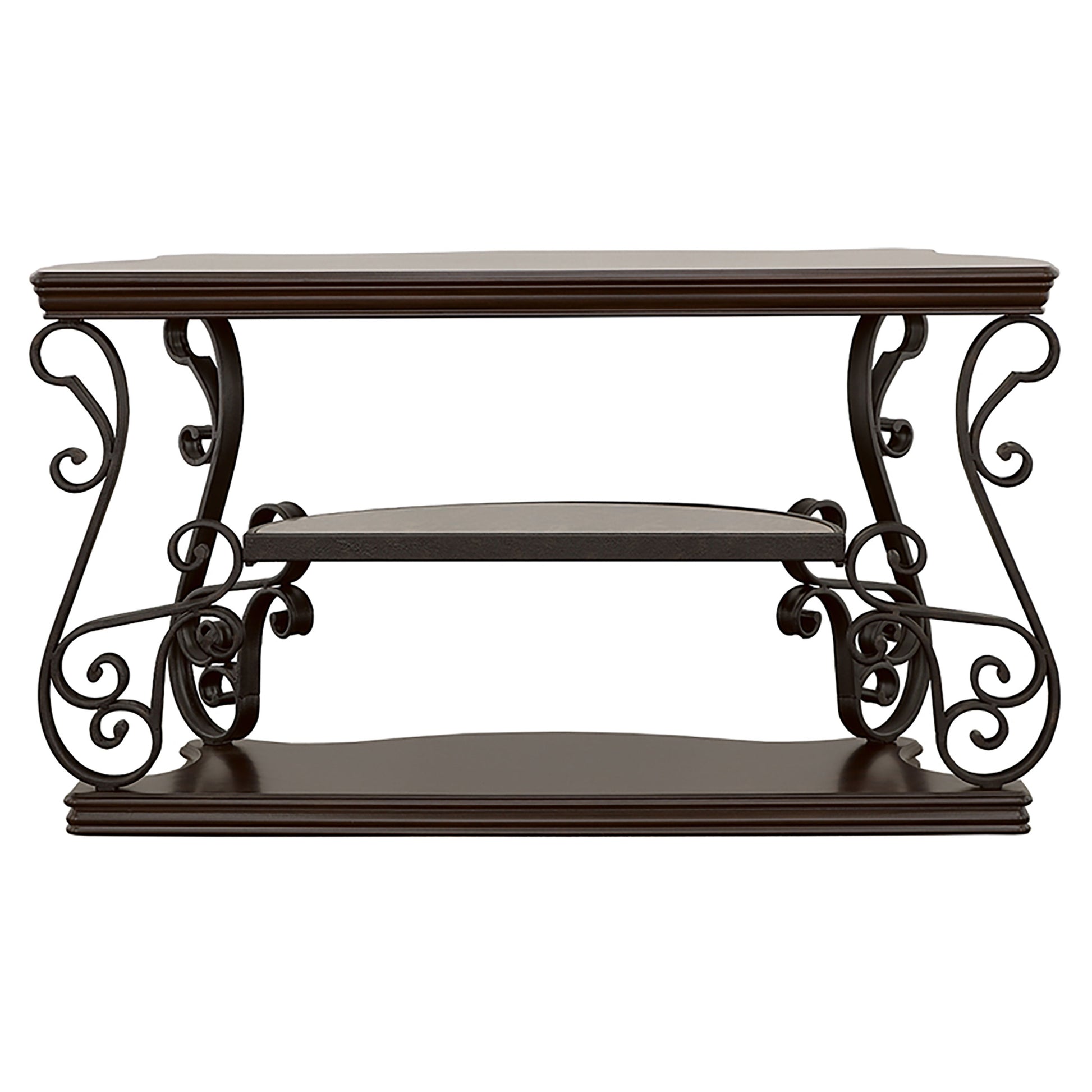 This elegant console table, also known as a sofa table, seamlessly combines style and function. Its dark merlot wood finish highlights the engineered wood and cherry veneer construction, while the ornate scrollwork on the dark bronze powder-coated metal legs enhances its timeless charm. The polished wooden middle and bottom shelves offer additional storage or display space. Perfect for accentuating hallways, living rooms, or behind sofas with classic sophistication.