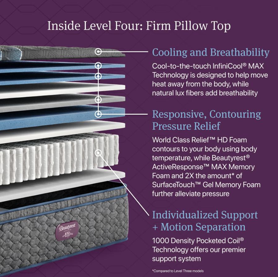 World Class Relief™ High Density Foam responsively reacts to body temperature for remarkable pressure relief, while thicker layers of Beautyrest® ActiveResponse™ MAX Memory Foam and SurfaceTouch™ Gel Memory Foam provide overall, upgraded pressure relief