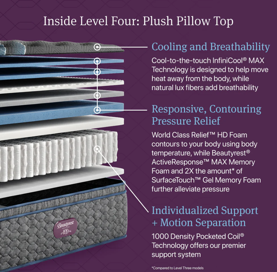 World Class Relief™ High Density Foam responsively reacts to body temperature for remarkable pressure relief, while thicker layers of Beautyrest® ActiveResponse™ MAX Memory Foam and SurfaceTouch™ Gel Memory Foam provide overall, upgraded pressure relief