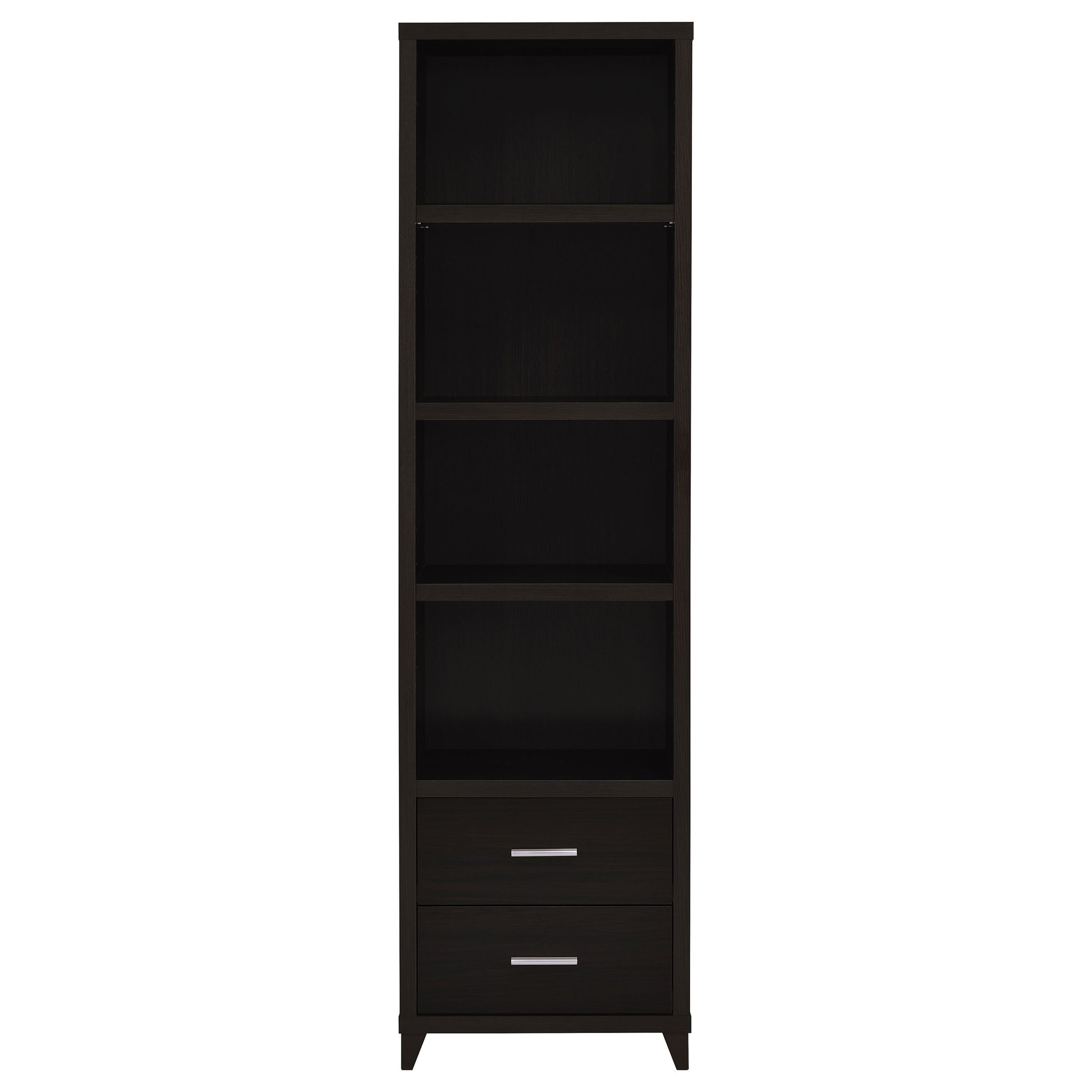Elevate your living room with this four-piece entertainment center, finished in rich cappuccino for a sleek contemporary look. The 60-inch TV console accommodates televisions up to 60 inches and includes two framed clear tempered glass doors, adjustable shelving, and three drawers for organized storage. Flanking media towers provide additional open shelving for books and decor, along with two drawers each for concealed items. A connecting bridge tops the unit, featuring two enclosed compartments to complete the design. Brushed silver hardware and tapered legs add refined finishing touches.