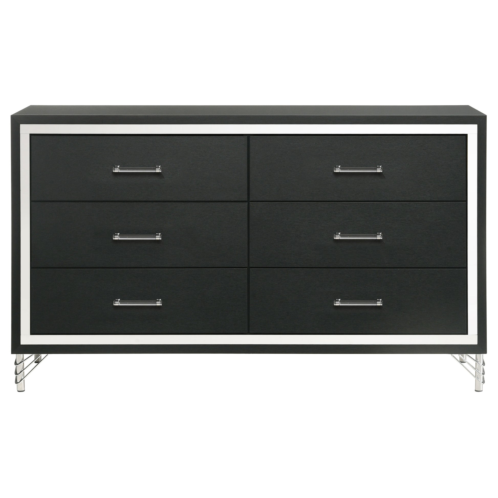 Accentuate surrounding decor with the sophistication of a modern six-drawer dresser. Designed for ample storage, it features a refined look with spacious drawers ideal for everything from clothing to accessories and linens. Its bold black finish is crisp and chic, complemented perfectly with rich, cool chrome trim that gleams in the light. Decorative legs have hairpin inspired style, offering a stylish touch of vintage energy. Long bar pulls complete the look with polished perfection.