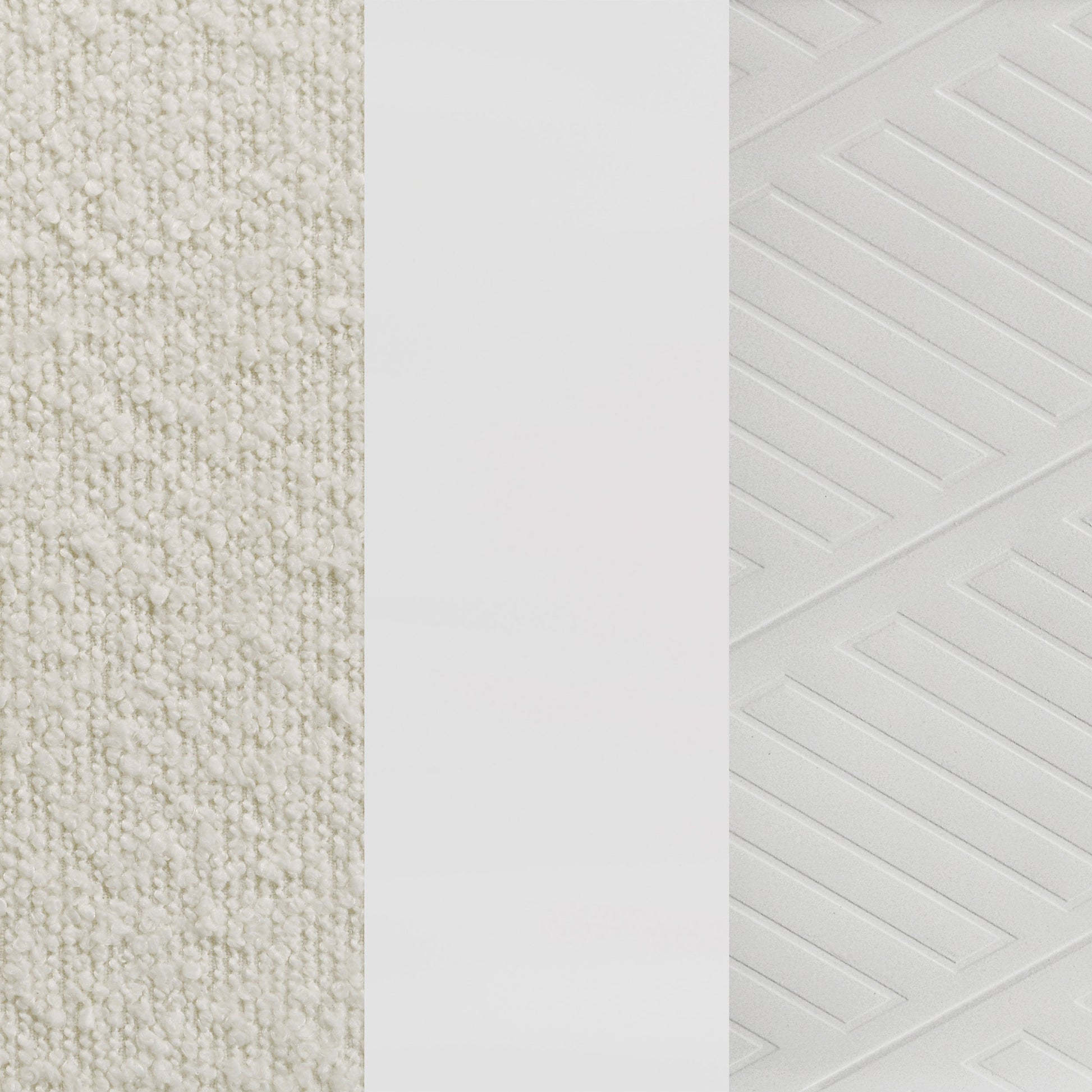 • Queen bed with 3-dimensional headboard upholstered in off-white boucle fabric