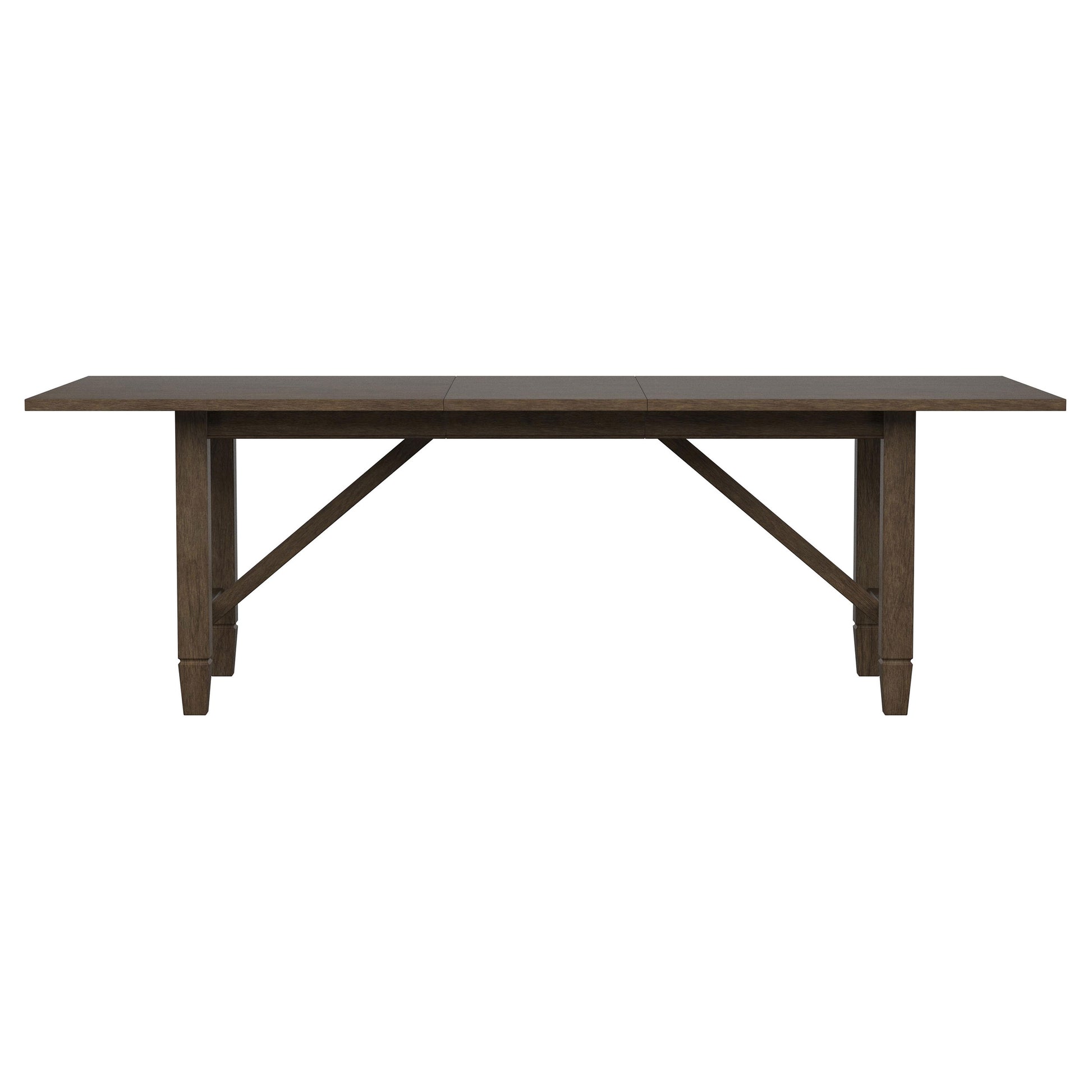 Set the tone in your stylish home with the welcoming ambiance of a modern farmhouse dining table. The rectangular table features a clean, streamlined silhouette complete with a recessed apron and decorative diagonal braces that bring architectural appeal. The table offers a natural wood finish to highlights its beautiful mahogany and rubberwood construction and veneers. The tabletop expands with the addition of the leaf, which measures 18-inches across to add seating for two more of your favorite people. Tapering feet are a subtle finishing touch, defined with linear trim that adds the perfect dose of dimensionality.