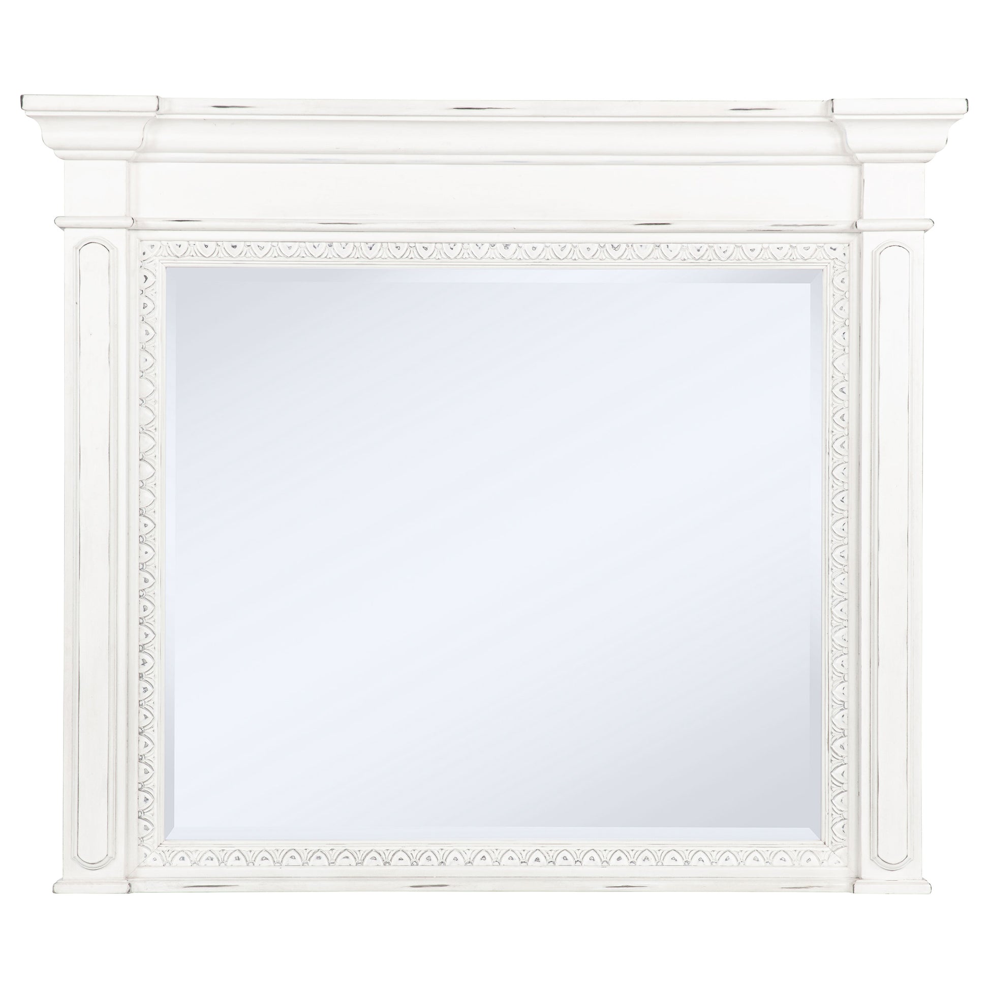 Designed to complement its matching dresser, this bedroom mirror brings graceful symmetry to the room. A crown-molded frame and carved trim highlight its vintage white finish, while the wide, rectangular shape reflects light and space. Mounted atop the coordinating dresser or hung alone, it completes the room with elegant ease.