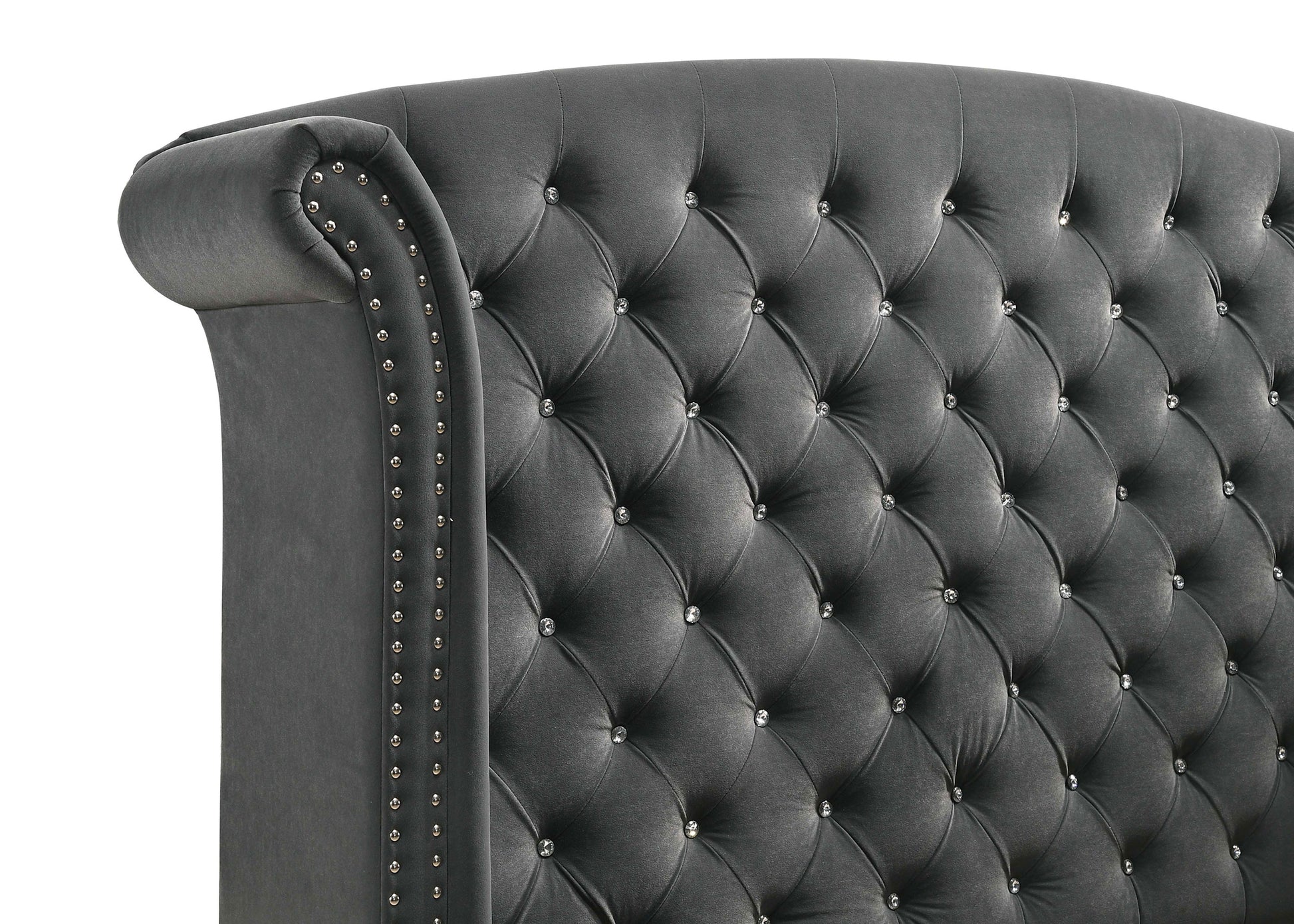• Soft grey velvet upholstery with acrylic button tufting and nailhead trim