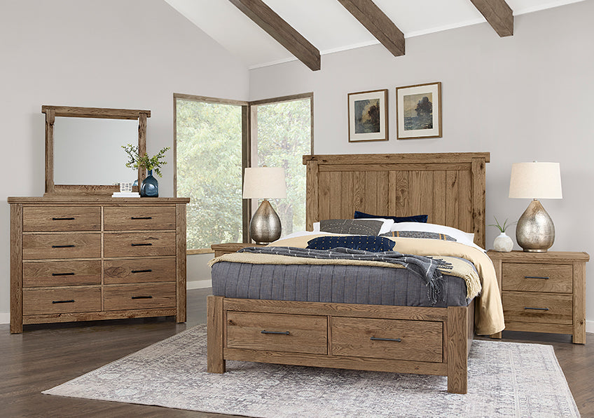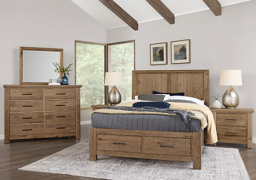| Featured-1 | Vaughan Bassett has developed a patent-pending process that allows them to accelerate how wood ages. We have kept the splits; knots; cracks; and the bold grain pattern found in Oak lumber to create this reclaimed look in this beautiful and unique bedroom | |
