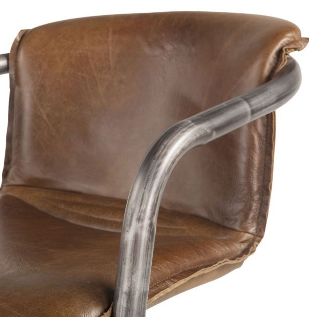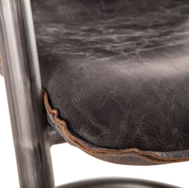 A blend of rustic and modern design marks the simplicity of the Portofino stool. Featuring distressed top grain leather with exposed raw edges and a vintage iron C-shaped frame to enhance its old age look and ensure maximum comfort.