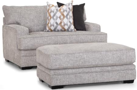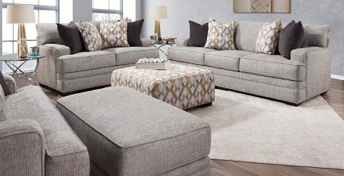 The Protege stationary collection is upholstered in Crosby Dove, a medium beige polyester fabric. The accent pillows are in a black solid and an interwoven line pattern in shades of brass, silver and white.