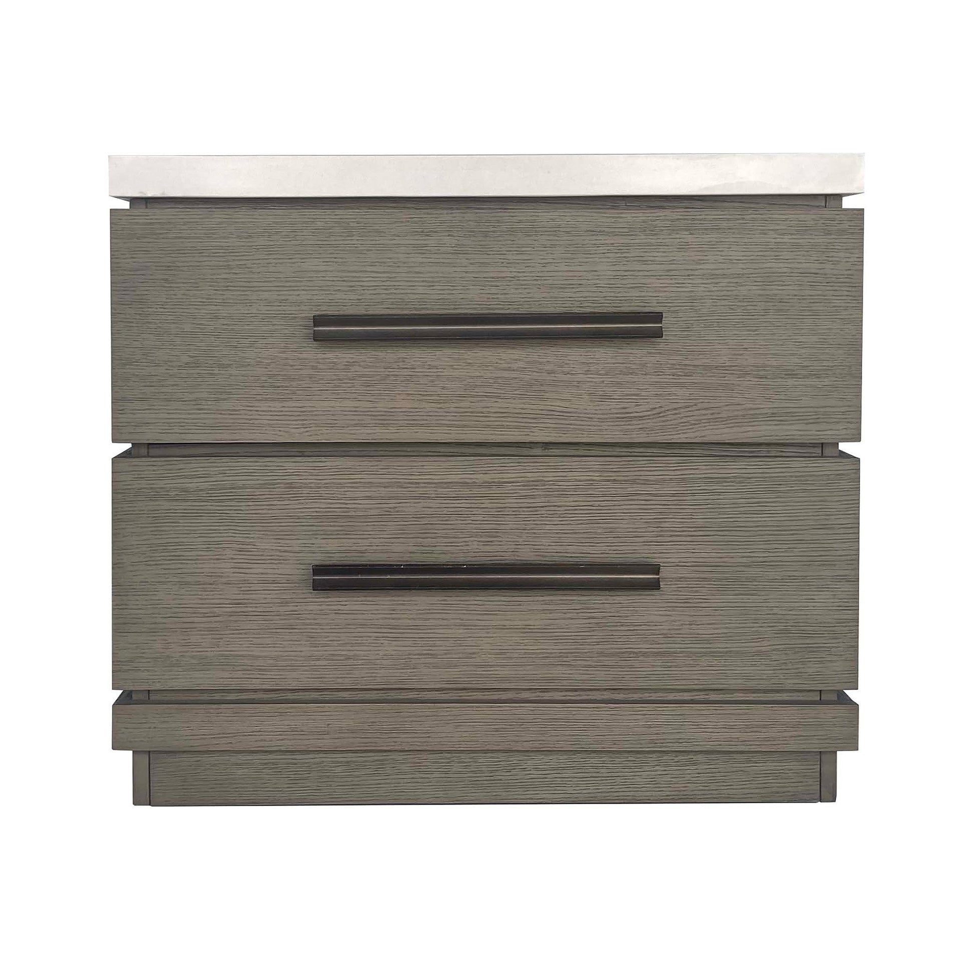 A Luxurious Quartz top adds timeless elegance and durability to this beautiful 2-drawer nightstand. Sleek and stylish, this nightstand is designed to bring a touch of modern sophistication to your bedroom. Two spacious drawers provide ample storage for bedside essentials and elegant Burnished Nickel hardware completes the look. A modern plinth base adds an element of architectural interest, making this nightstand a beautiful addition to any decor.