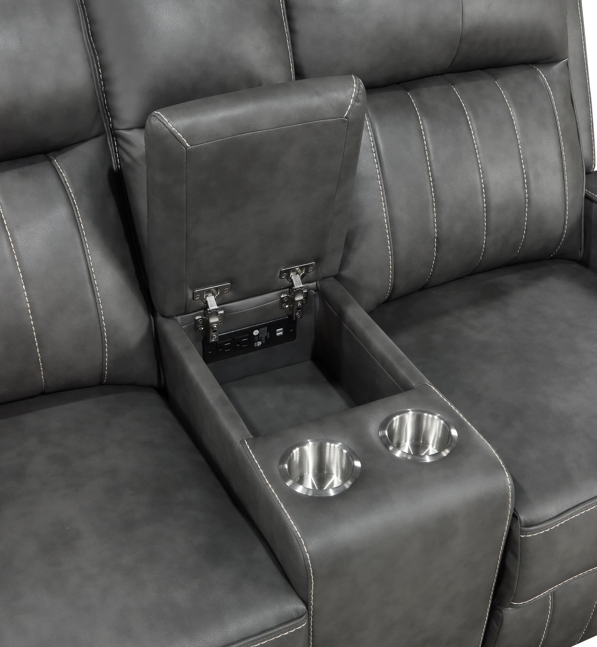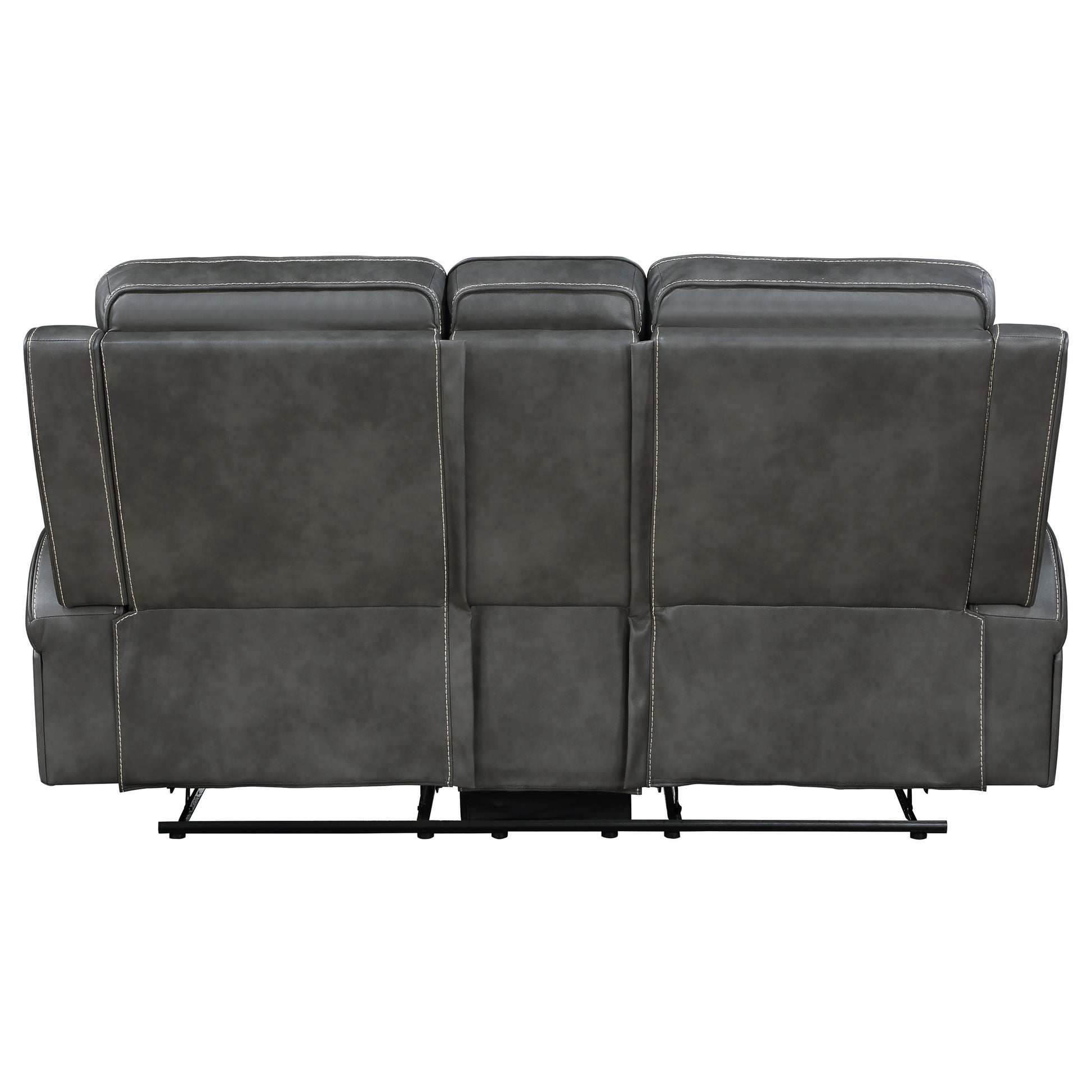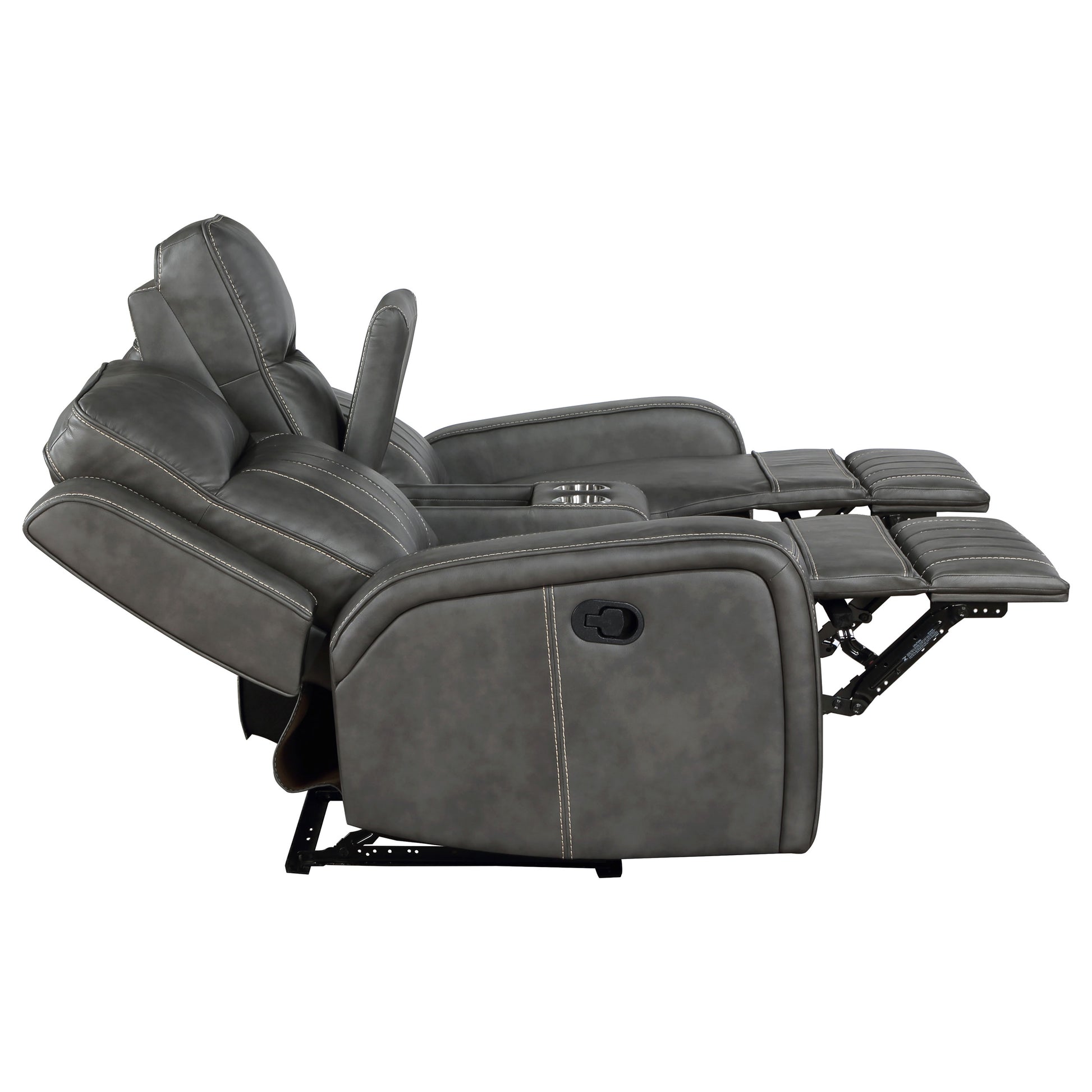 Blending modern and transitional design, this motion loveseat delivers both style and comfort. Upholstered in smooth grey leatherette, it features decorative vertical topstitching for visual dimension. Plush foam padding and pocket coil spring cushions provide supportive comfort, while ultra-padded headrests enhance relaxation. A wall-hugger reclining mechanism saves space, and a flip-top center console offers storage for remotes and essentials. Two built-in cup holders keep beverages within reach, making this loveseat perfect for everyday lounging.