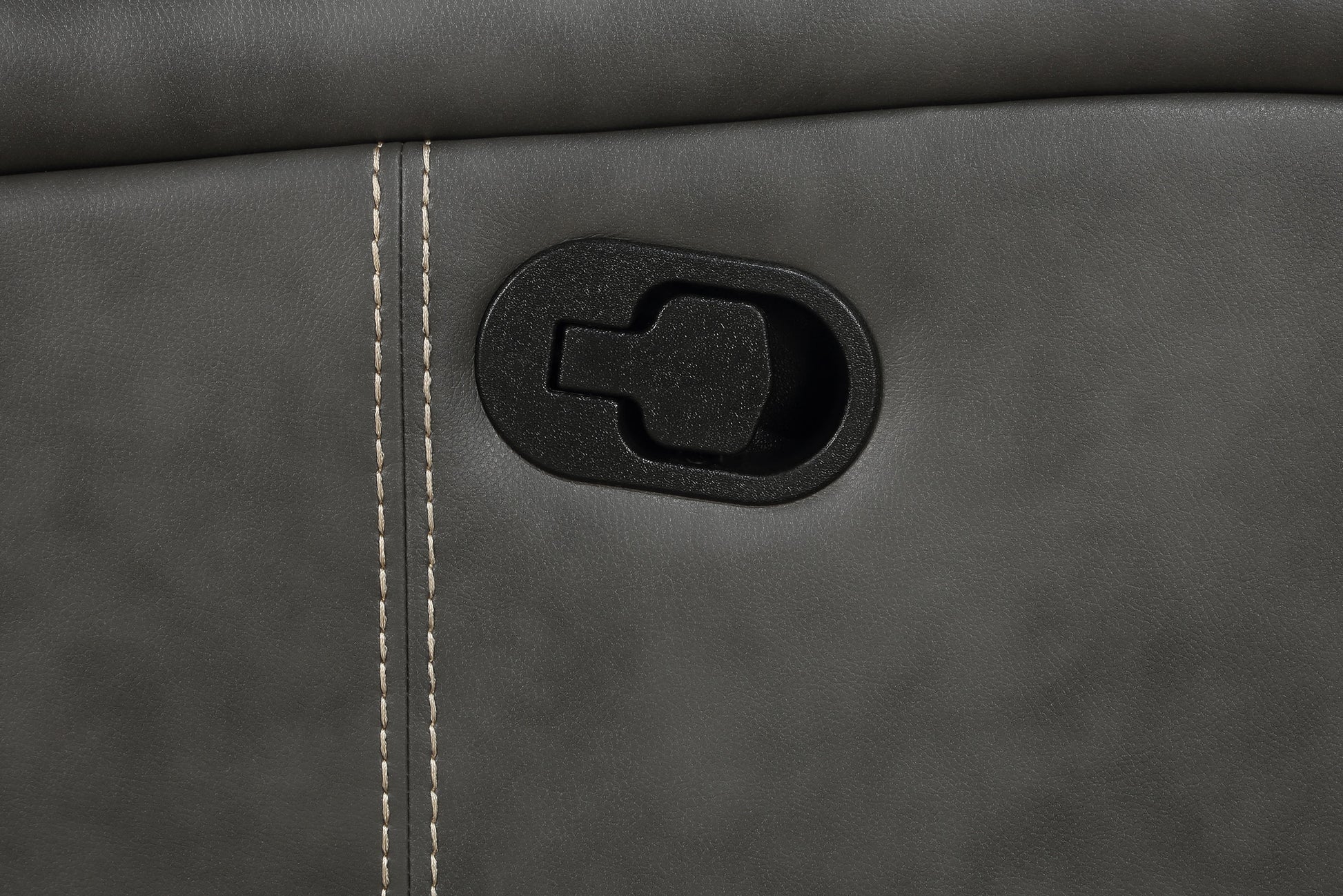 • Motion sofa upholstered in smooth grey leatherette with decorative topstitching